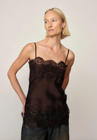 A returning favorite, designed in smooth satin with delicate lace detailing along neckline and hem. Available this season in light blue with crème lace and dark brown. A timeless piece that transitions effortlessly from day to evening.