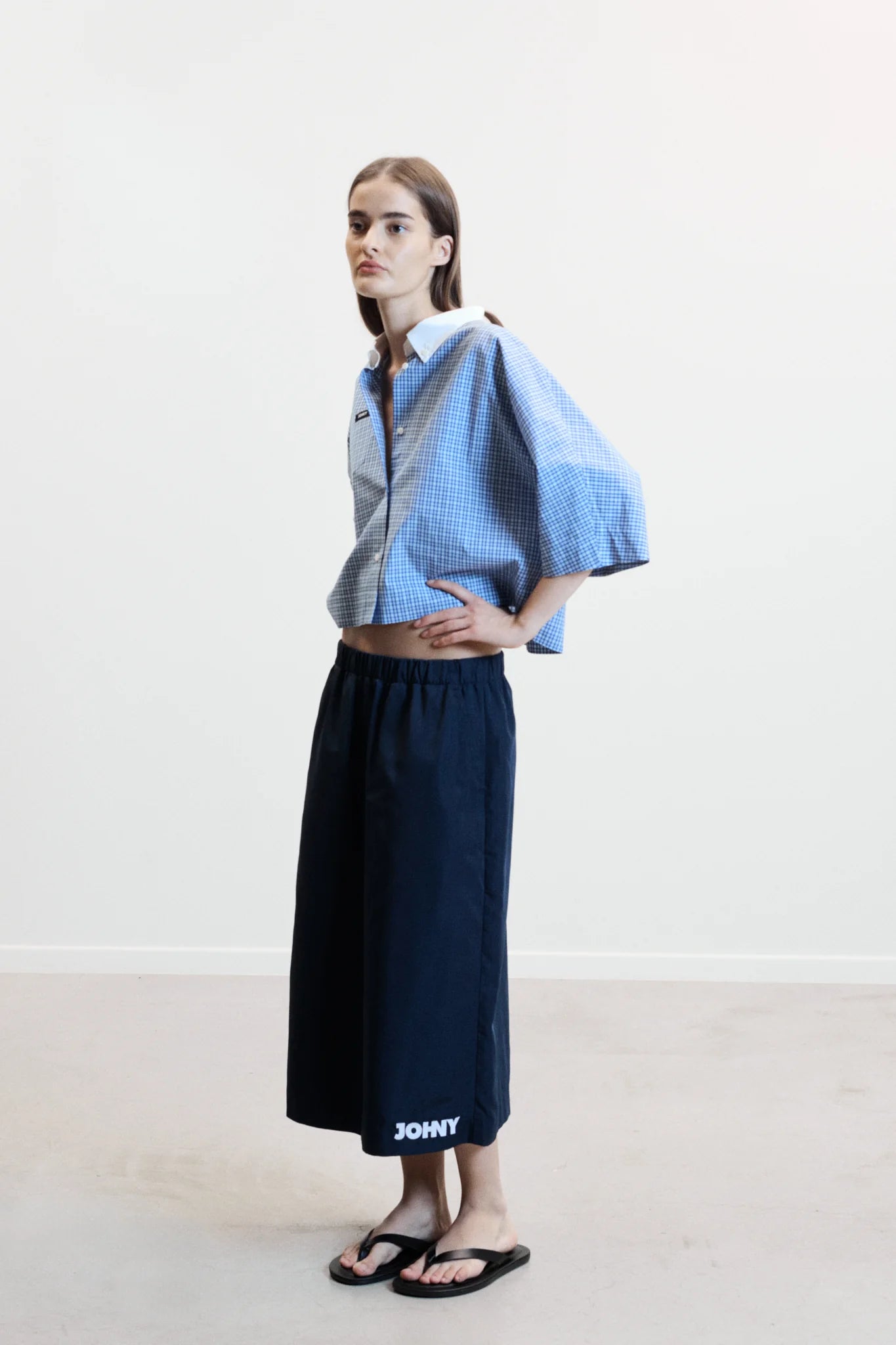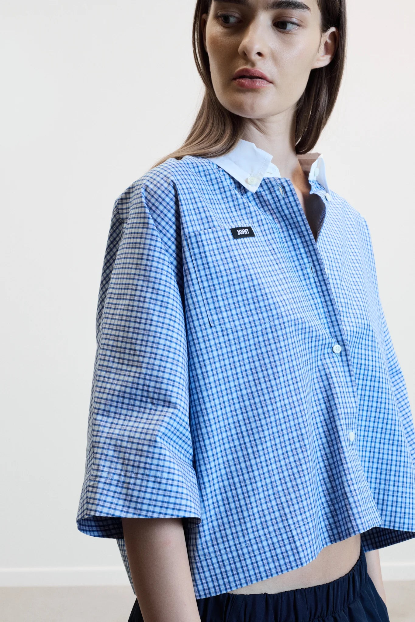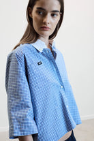 Effortless and contemporary, the shirt in blue check is a cropped silhouette designed for modern ease. Crafted in soft cotton with a crisp white button-down collar, it balances comfort and structure for a seasonless, versatile wardrobe essential.