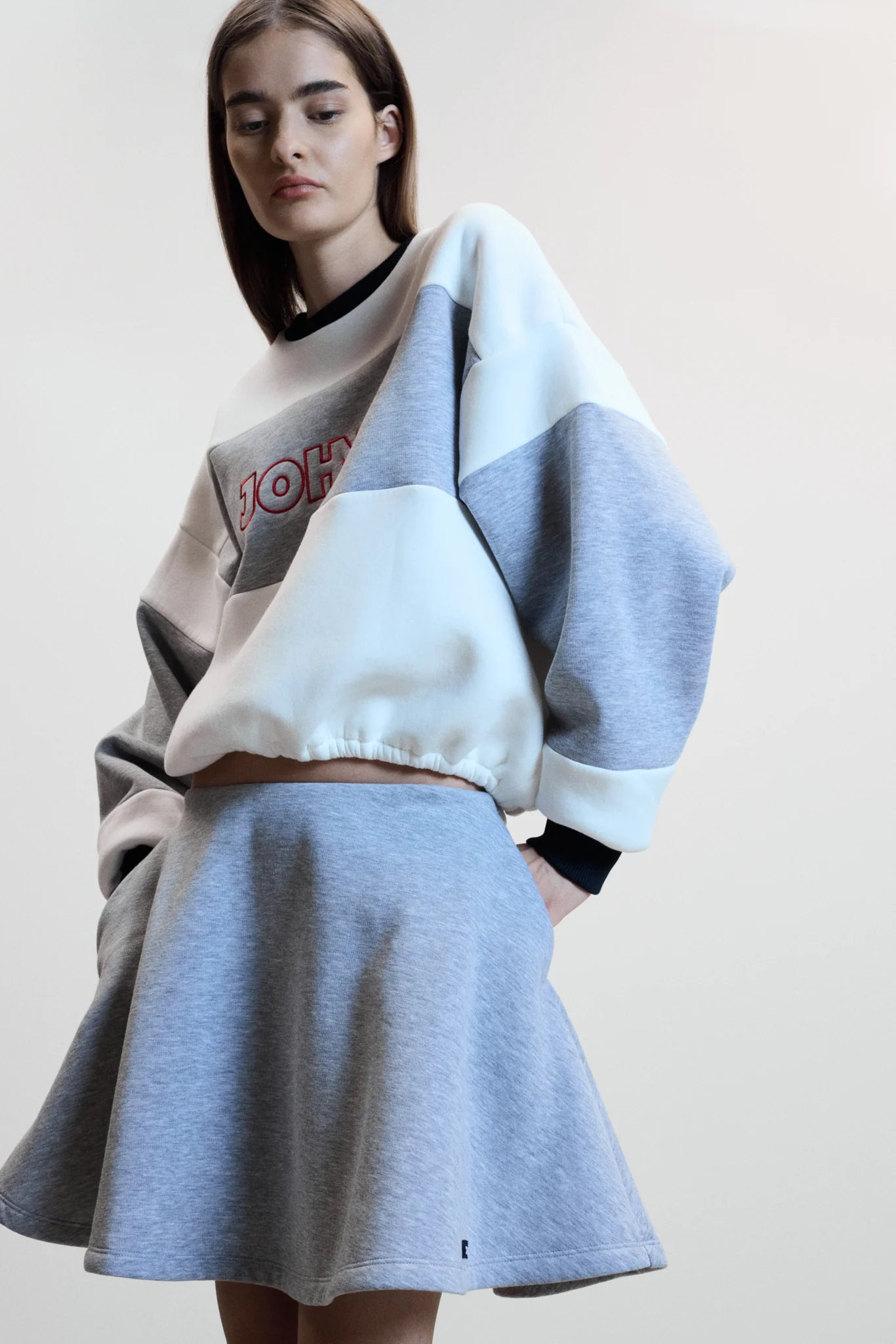 The skirt in grey offers a clean, contemporary silhouette with its wide mini shape and soft texture. Effortless and seasonless, it brings a modern ease to everyday wear.