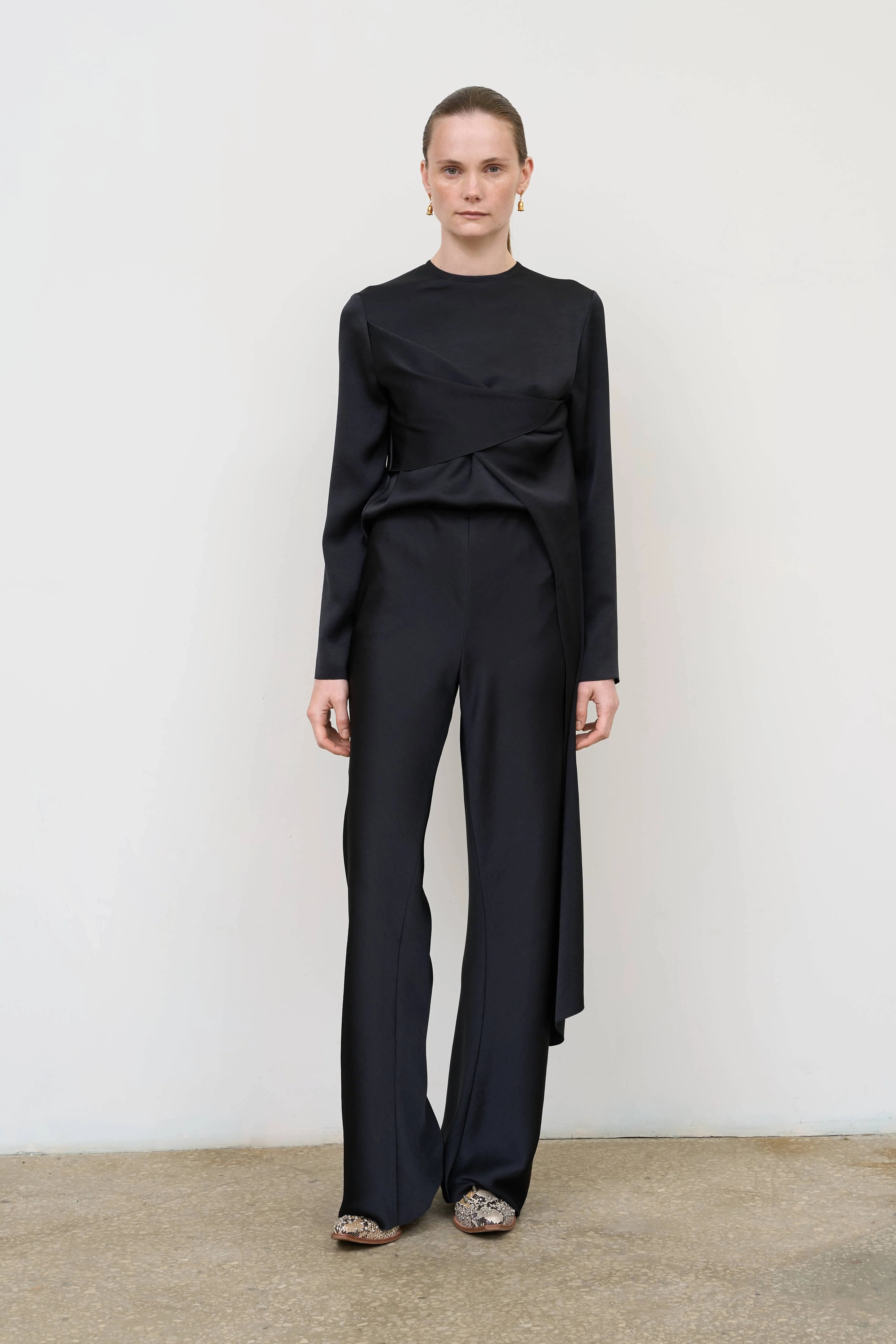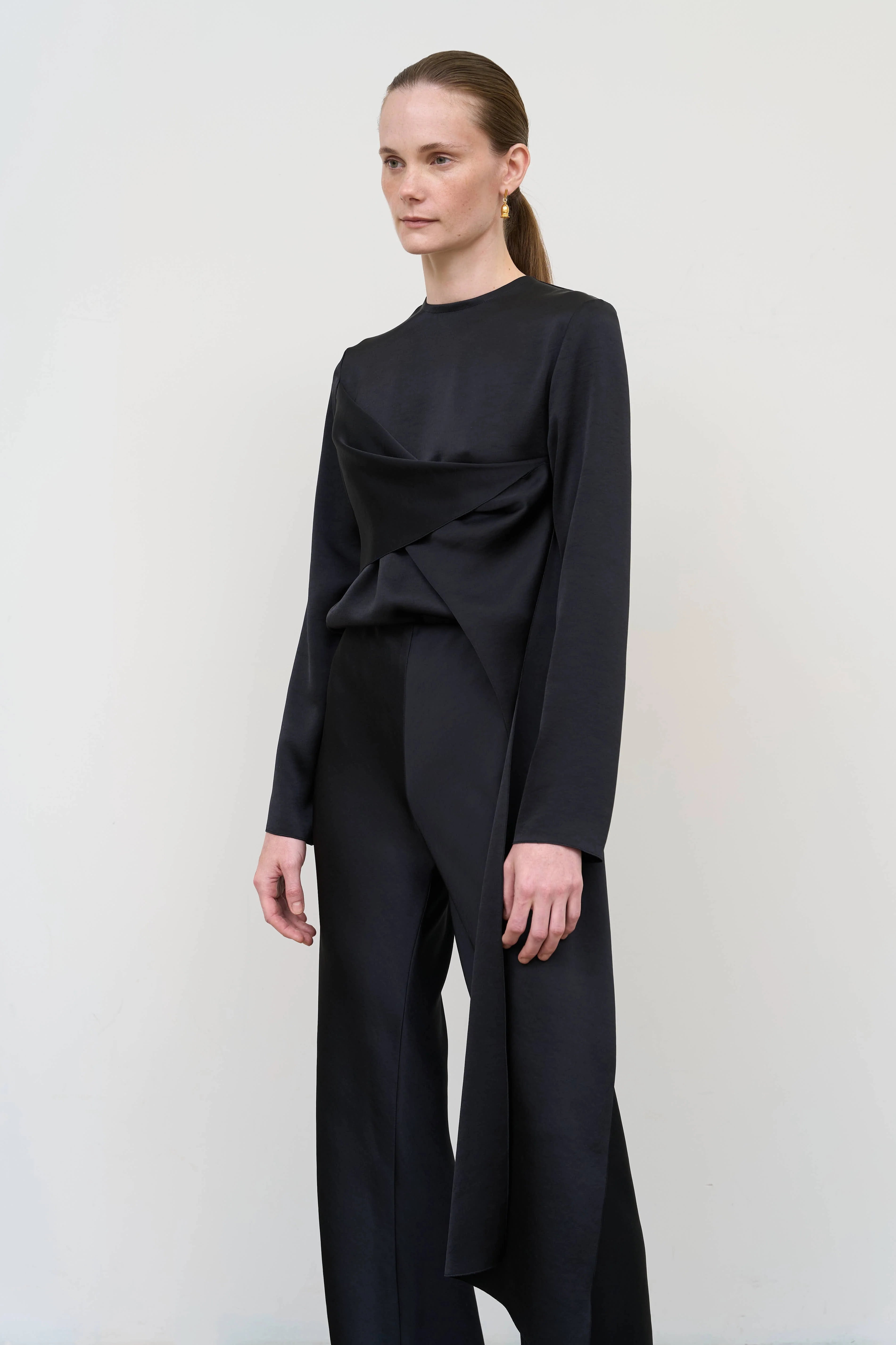 Asymmetric blouse with refined twist detail, creating volume and silhouette dynamics. Light shapes and flexible structure make the blouse versatile and stylish, adding charm and expressiveness to each look.