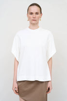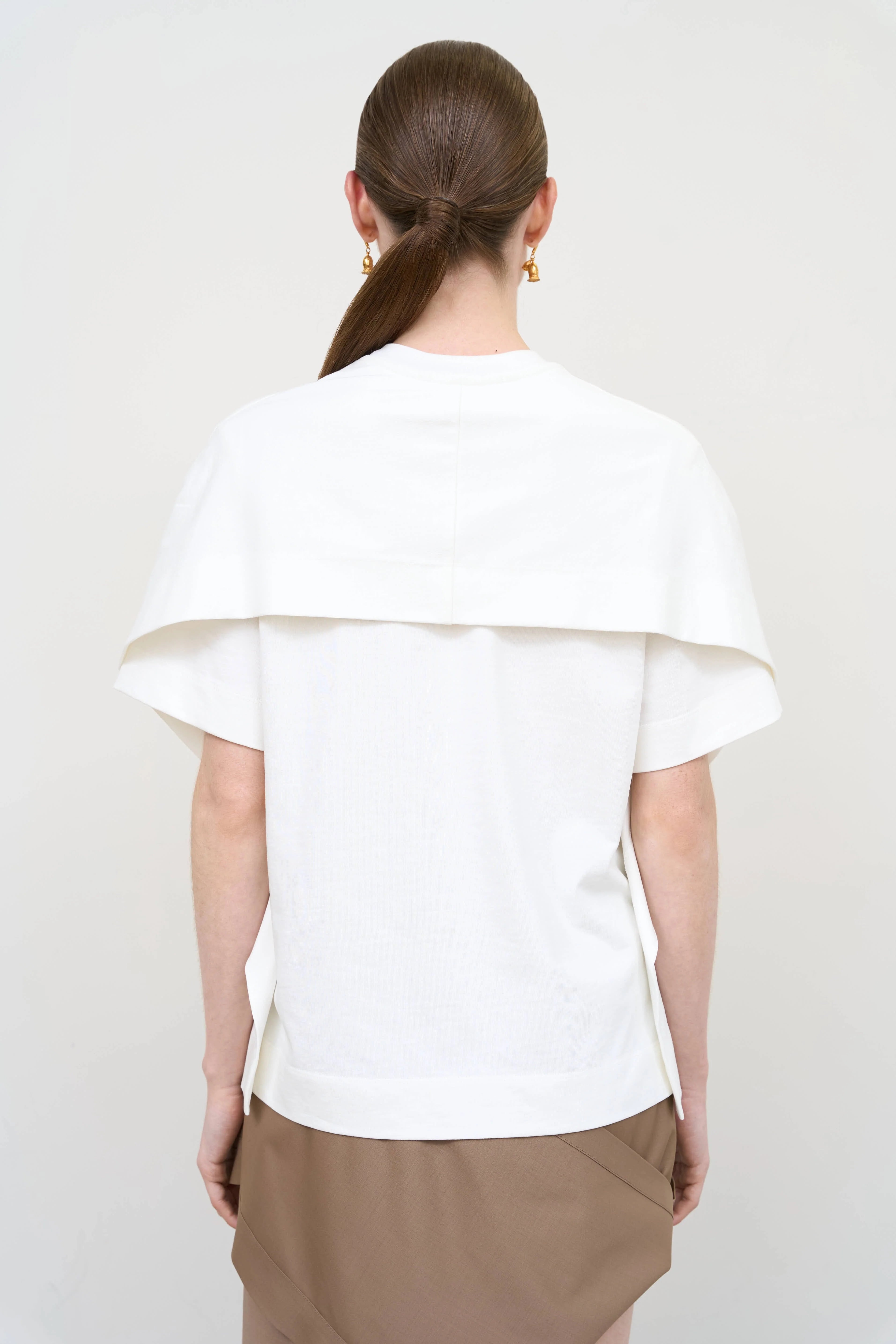 T-shirt with layering and voluminous upper part, creating a light and dynamic silhouette. Back accents add expressiveness, and soft lines with thoughtful structure make the look modern and unique.