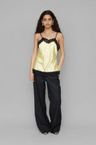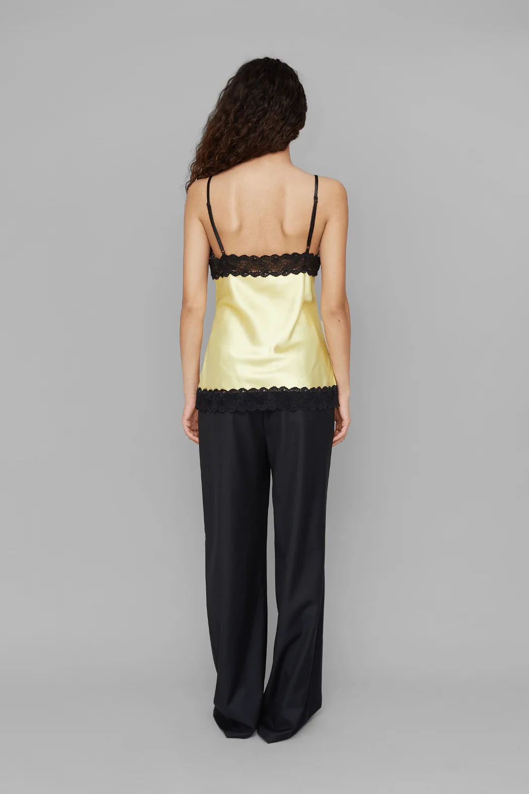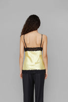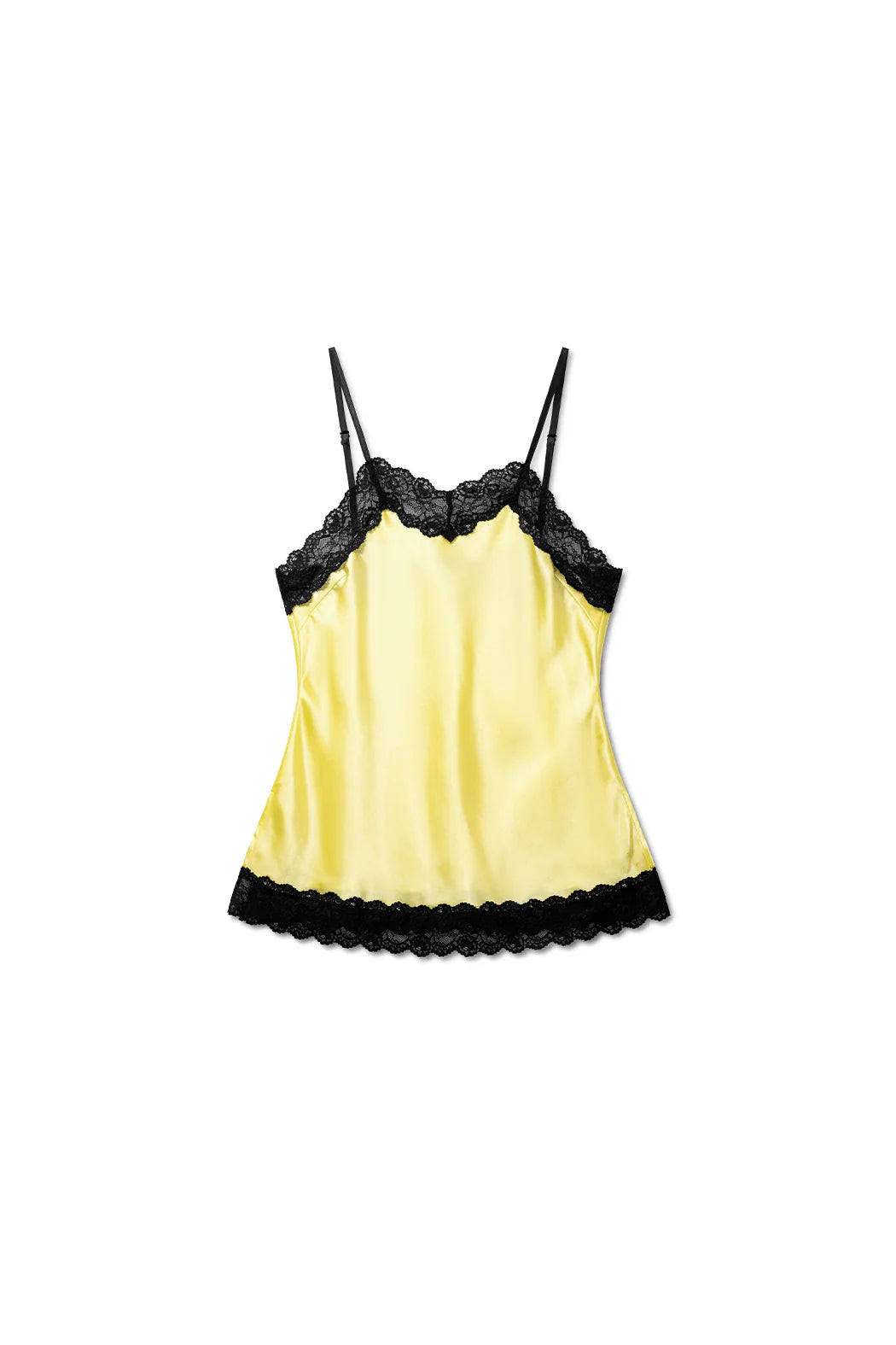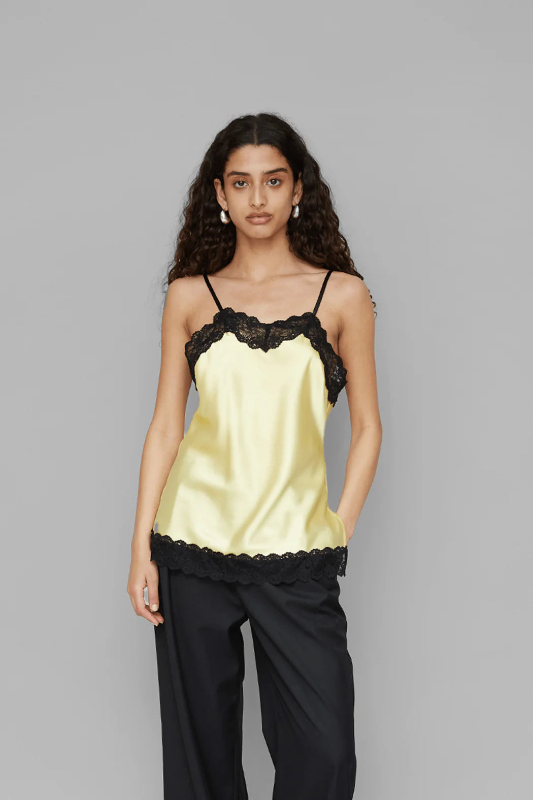 The camisole top is crafted from 100% recycled polyester in elfin yellow. Designed with thin straps, it features delicate black lace detailing along the neckline and bottom edge. The soft satin-like finish and relaxed silhouette give it a refined yet effortless feel.