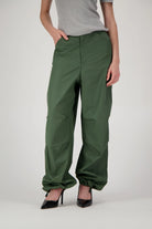 Straight-leg pants in lightweight cotton, featuring knee darts, back pleats, an elastic waistband, and pockets.