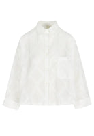 button-down in high quality cotton embroidery fabric, with boxy fit, chest pocket, and double roll button cuffs. Relaxed silhouette with slightly cropped sleeves.