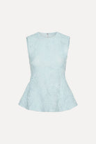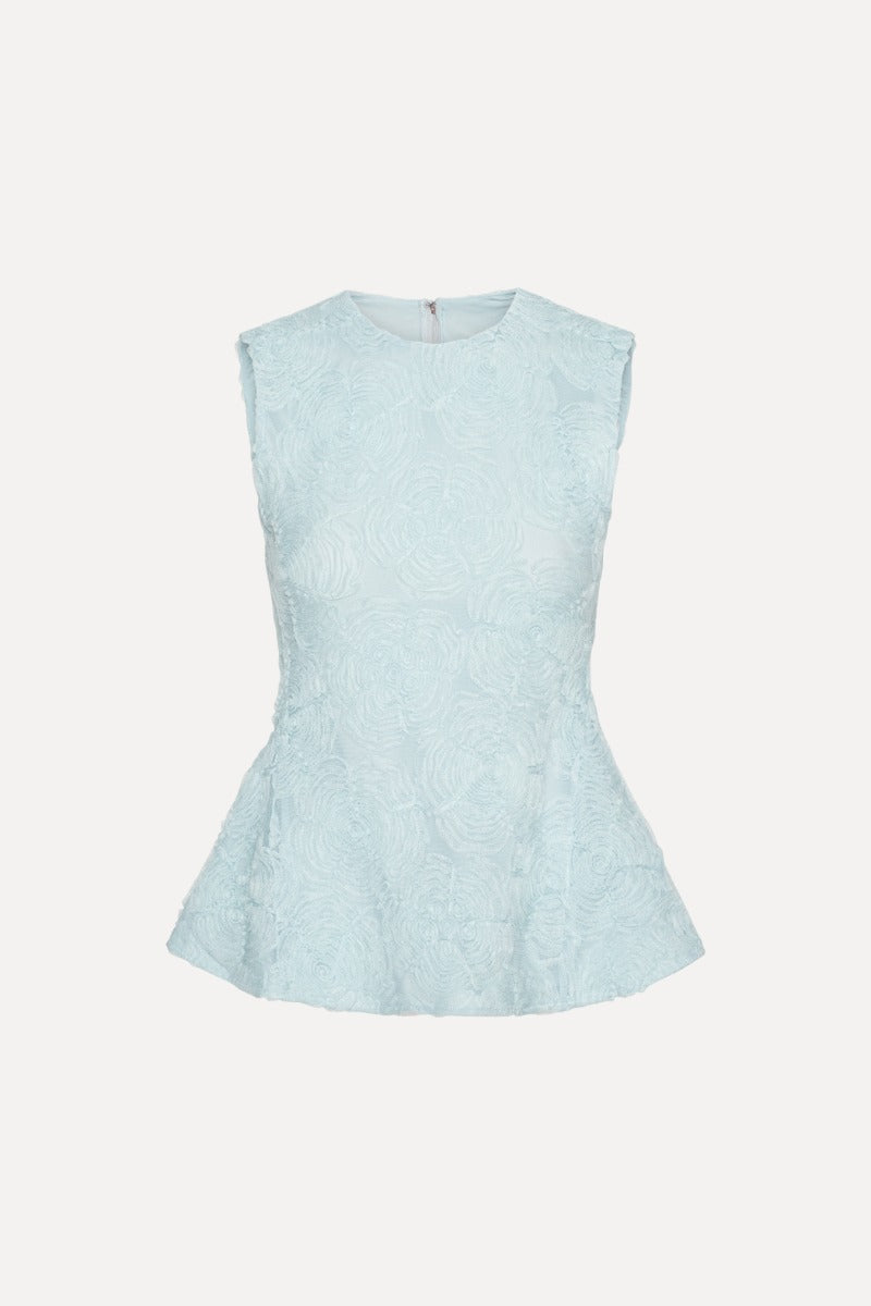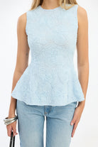 Mesh sleeveless top in blue. This sleeveless top features a round neckline and a fitted waist that flares into a subtle peplum hem. The design has an all-over textured mesh surface with a floral pattern and a clean back zip closure.
