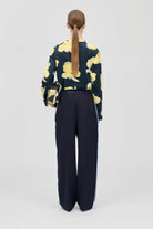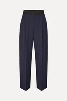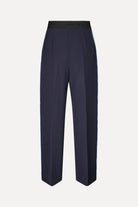 navy relaxed-fit wide-leg suit pants with an elasticated waistband and embossed logo detail. featuring a timeless pleated silhouette, practical side pockets and refined blanket stitch accents along the sides for an elevated finish.