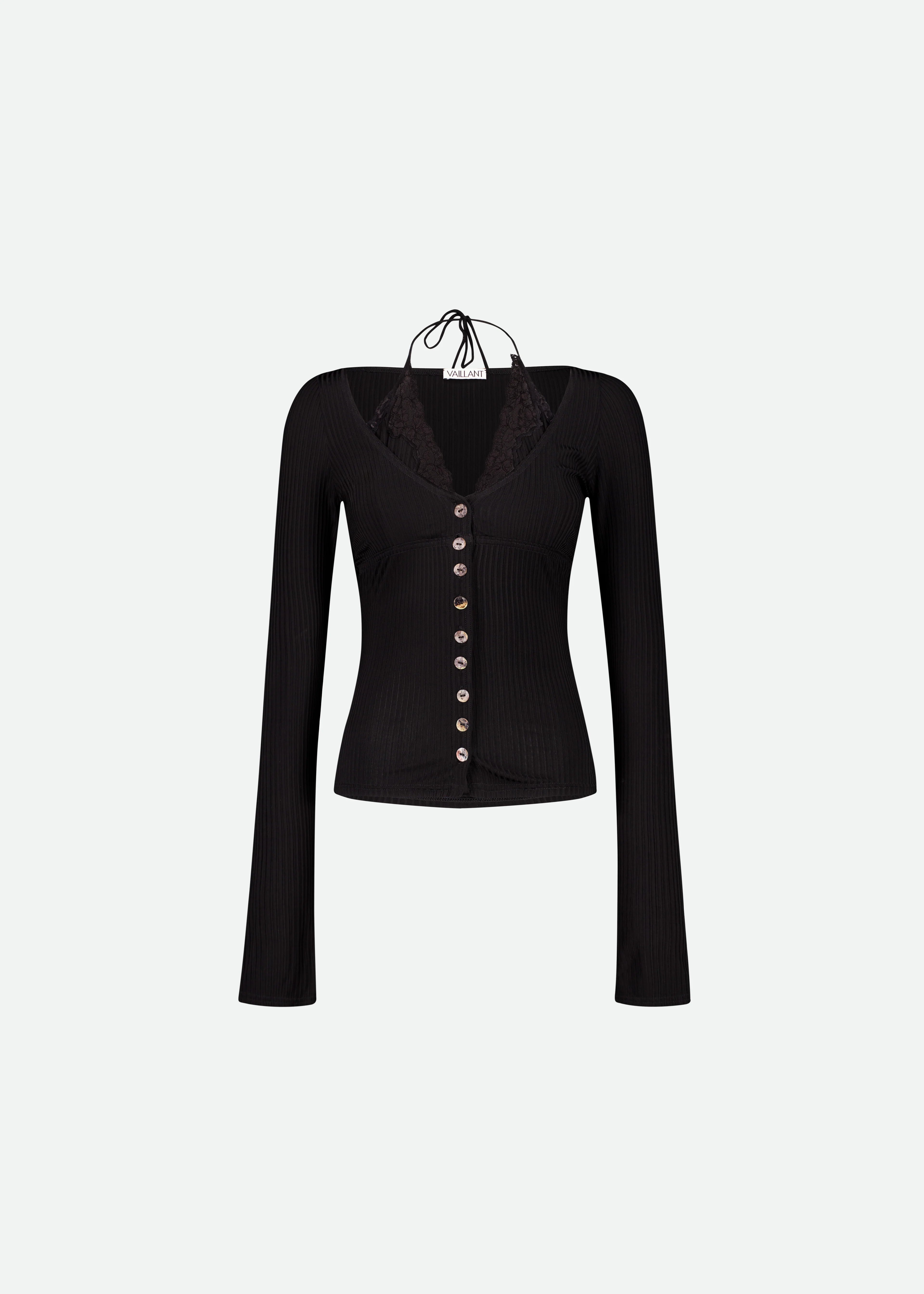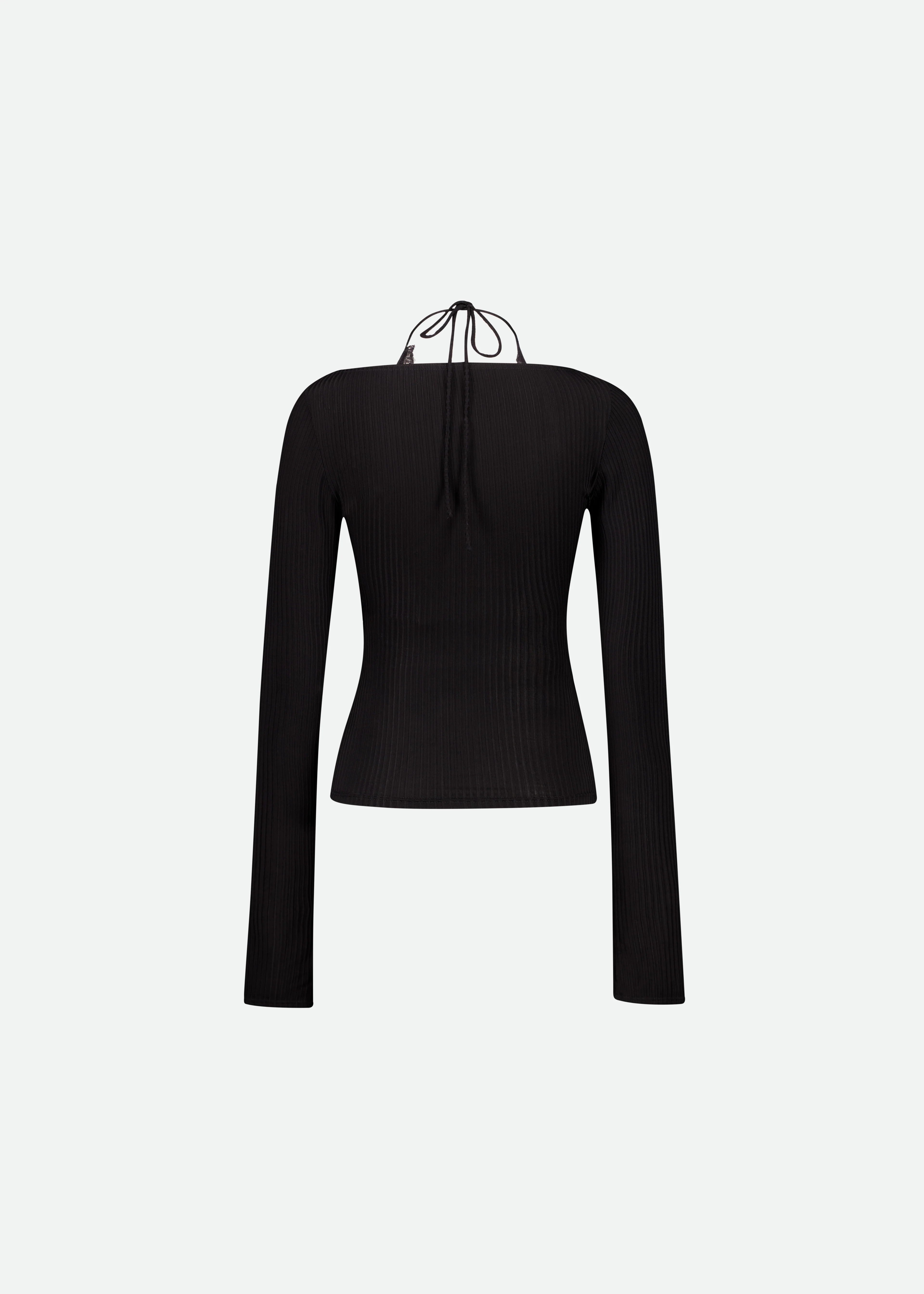The Bradigan Top updates classic knitwear with a sensual twist. Made from stretchy ribbed jersey, it features a slim fit, deep neckline, and built-in triangle bralette that ties at the neck. Button detailing and long sleeves create a clean, sculpted shape.