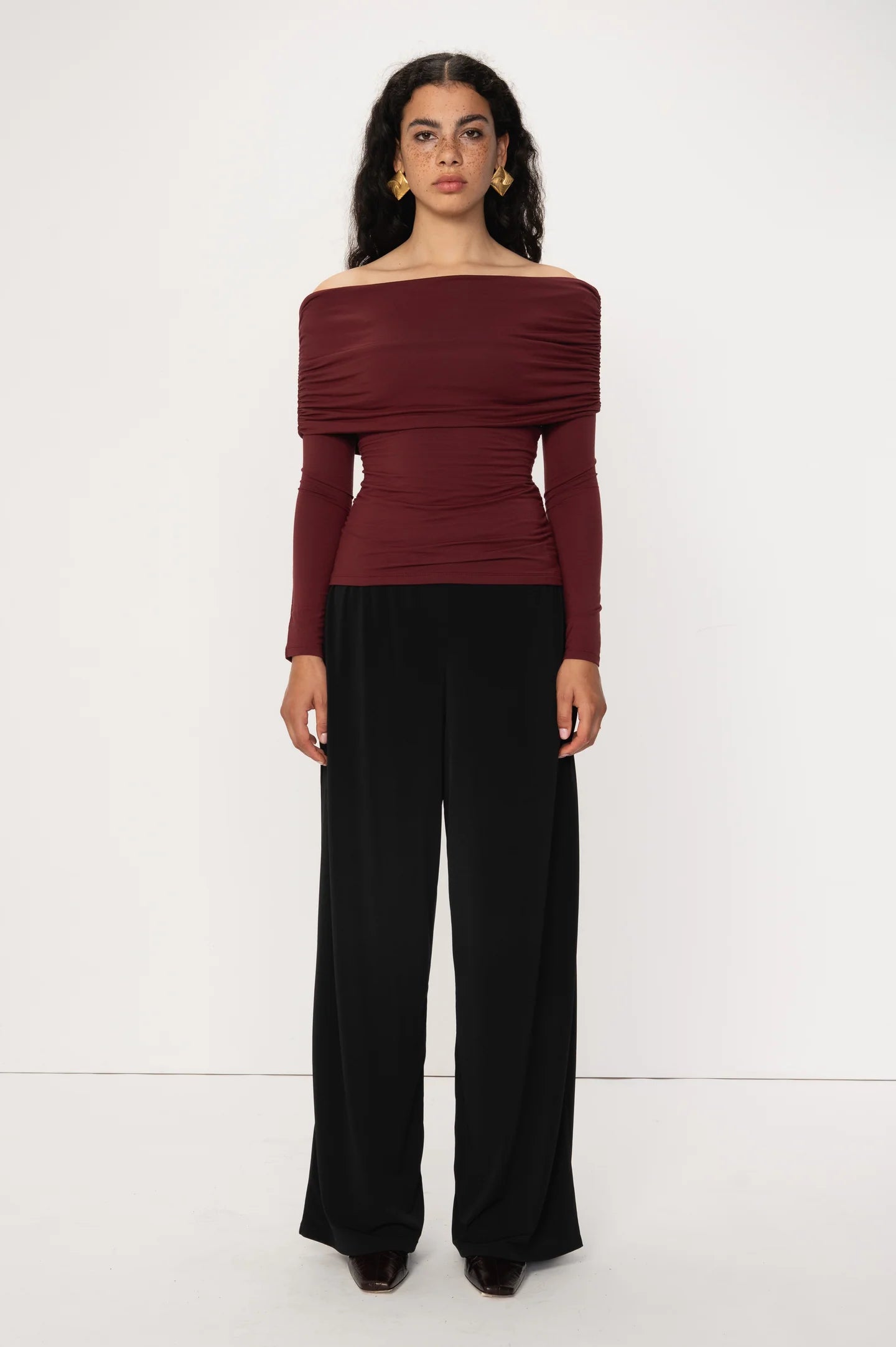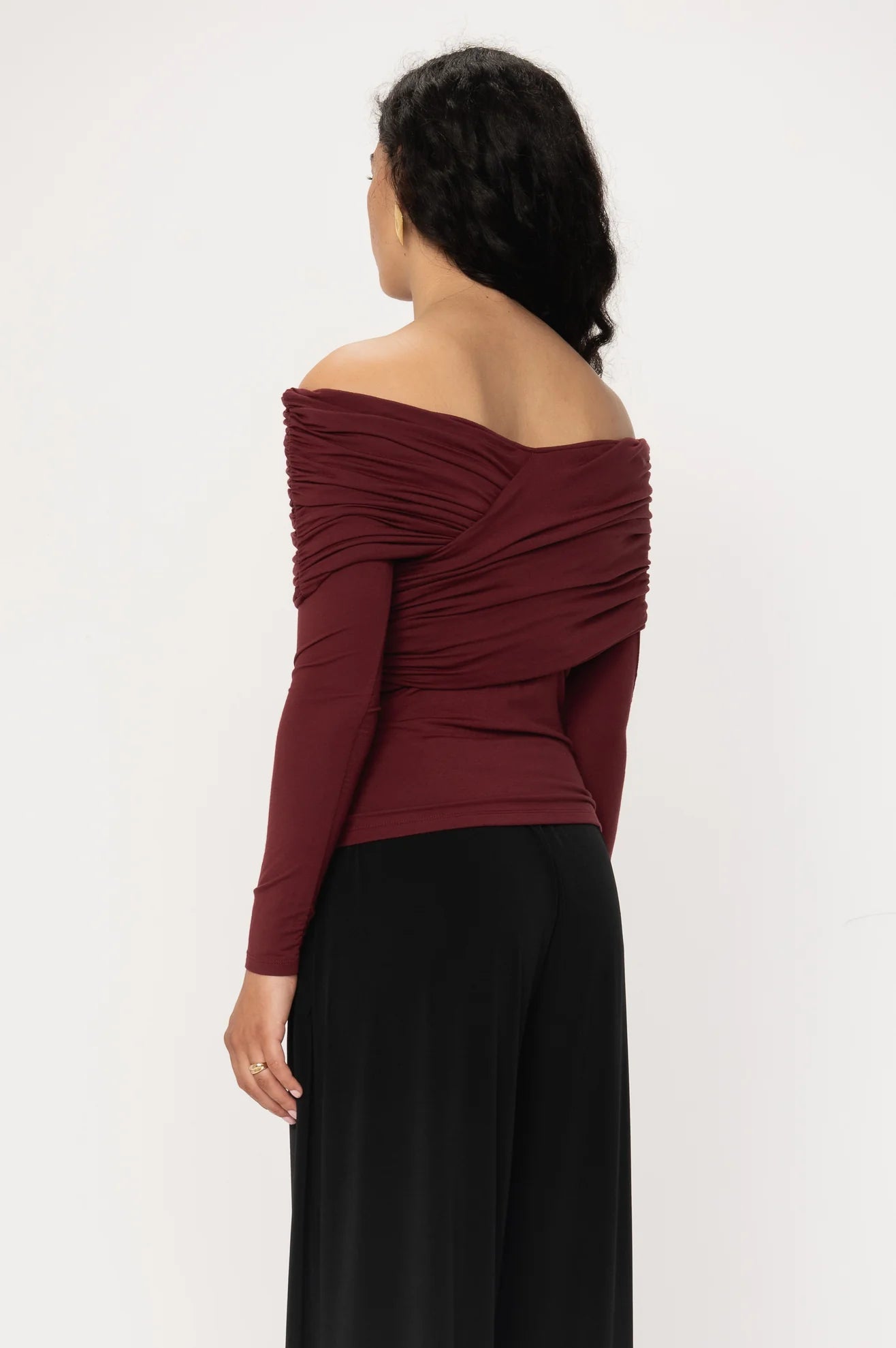 The long sleeves and a gathered, off-the-shoulder cut creates a beautiful wrap across the chest, making it the perfect evening top. The Boxus can be reversed giving you the option of two different necklines. The top is double-lined for extra support.