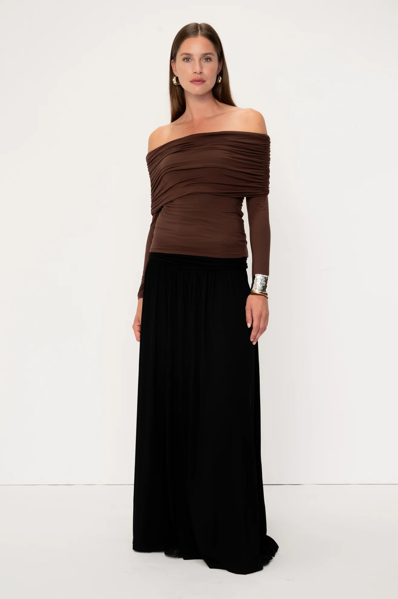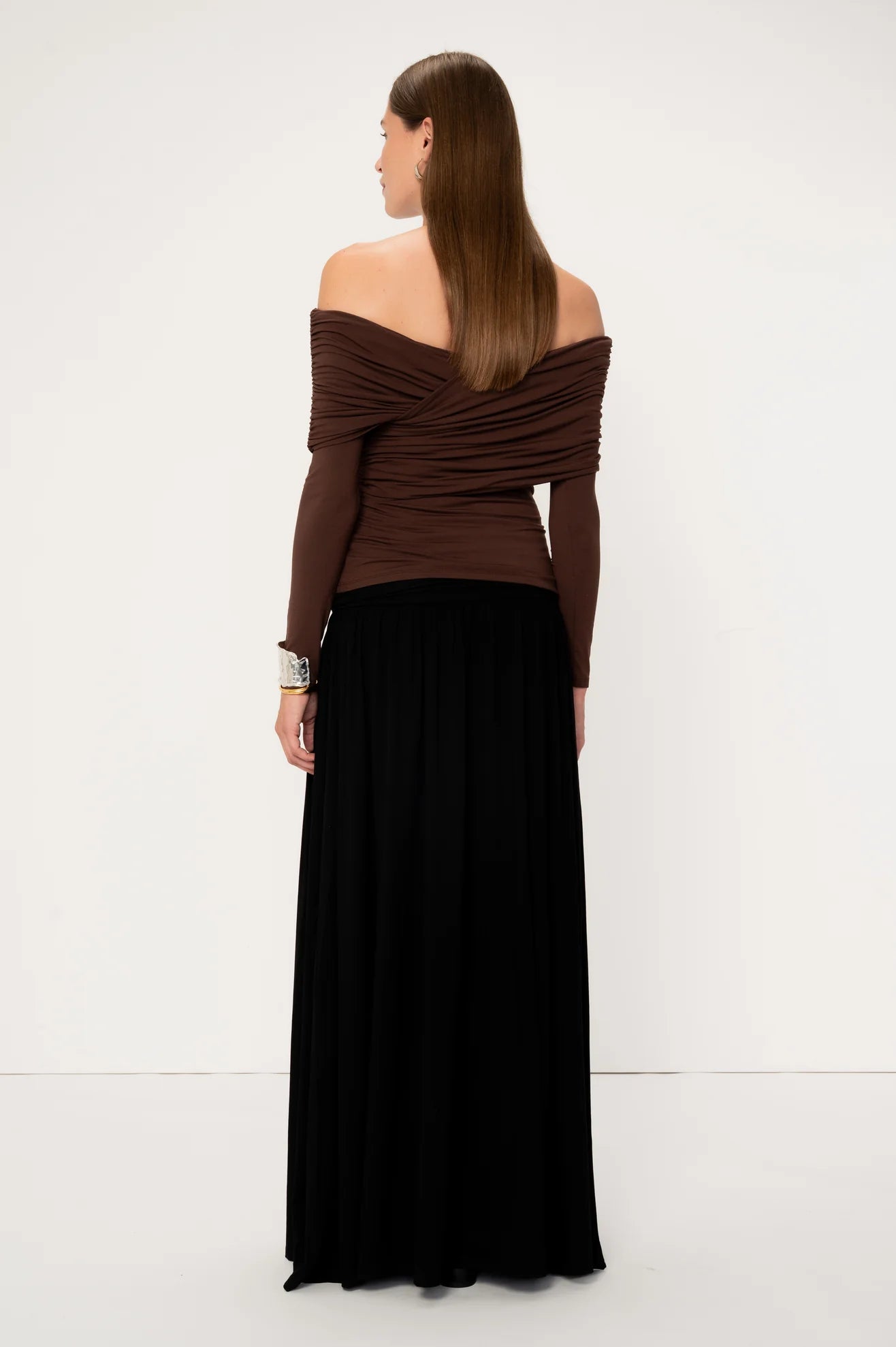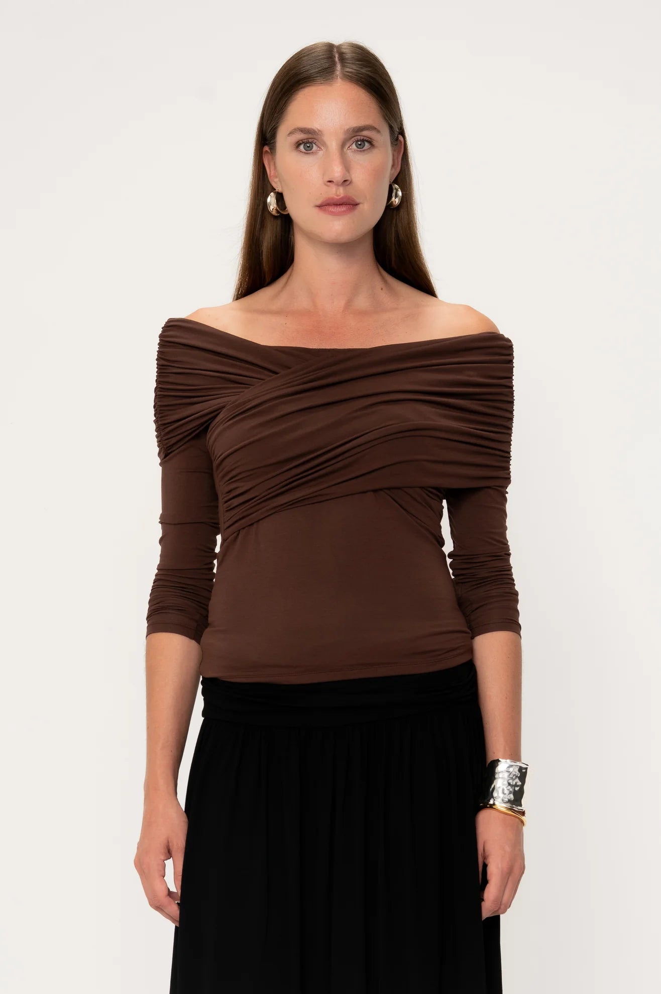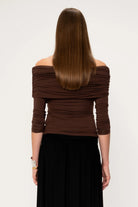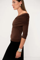 The long sleeves and a gathered, off-the-shoulder cut creates a beautiful wrap across the chest, making it the perfect evening top. The Boxus can be reversed giving you the option of two different necklines. The top is double-lined for extra support.