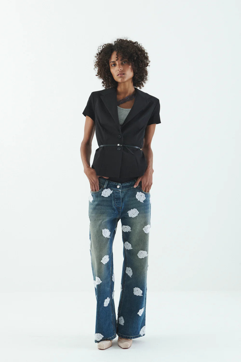 structured blazer jacket cut in a fitted silhouette, featuring a dramatically tailored waist and short cap sleeves.