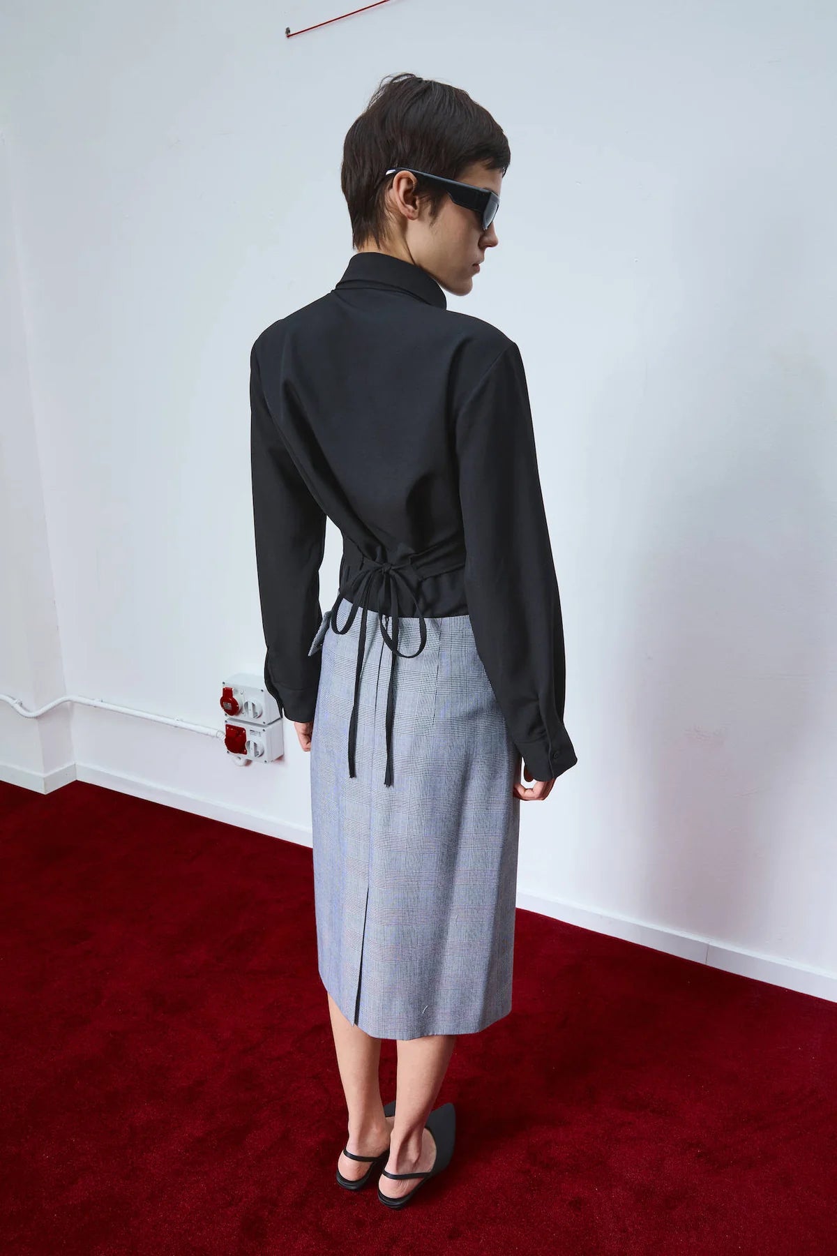 This long-sleeve shirt combines classic tailoring with a contemporary twist. Defined by an overlapping panel across the chest, it creates a layered effect that reimagines traditional shirting. The structured silhouette is complemented by a button-down front and pointed collar, offering a refined yet modern edge. The adjustable tie at the back allows for a customizable fit, making it versatile for both sleek and relaxed styling.