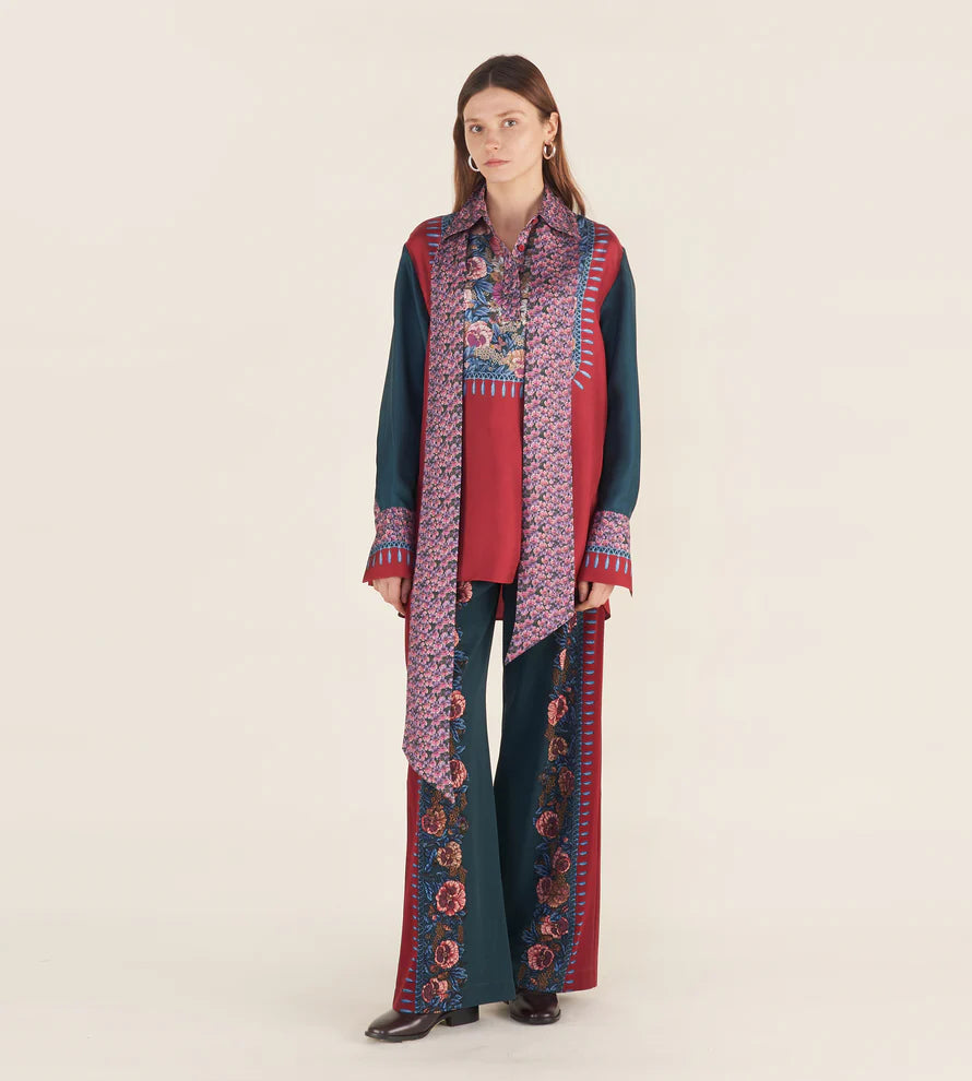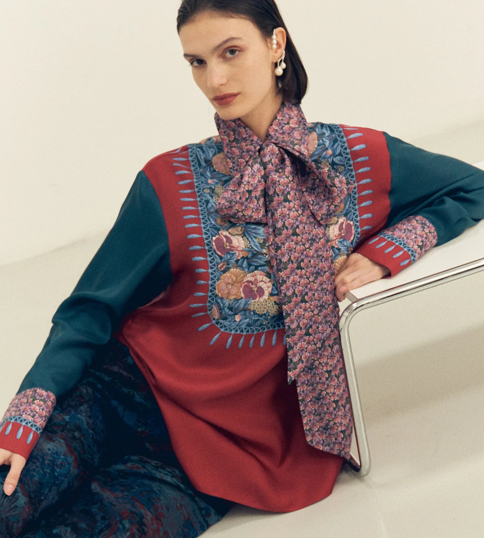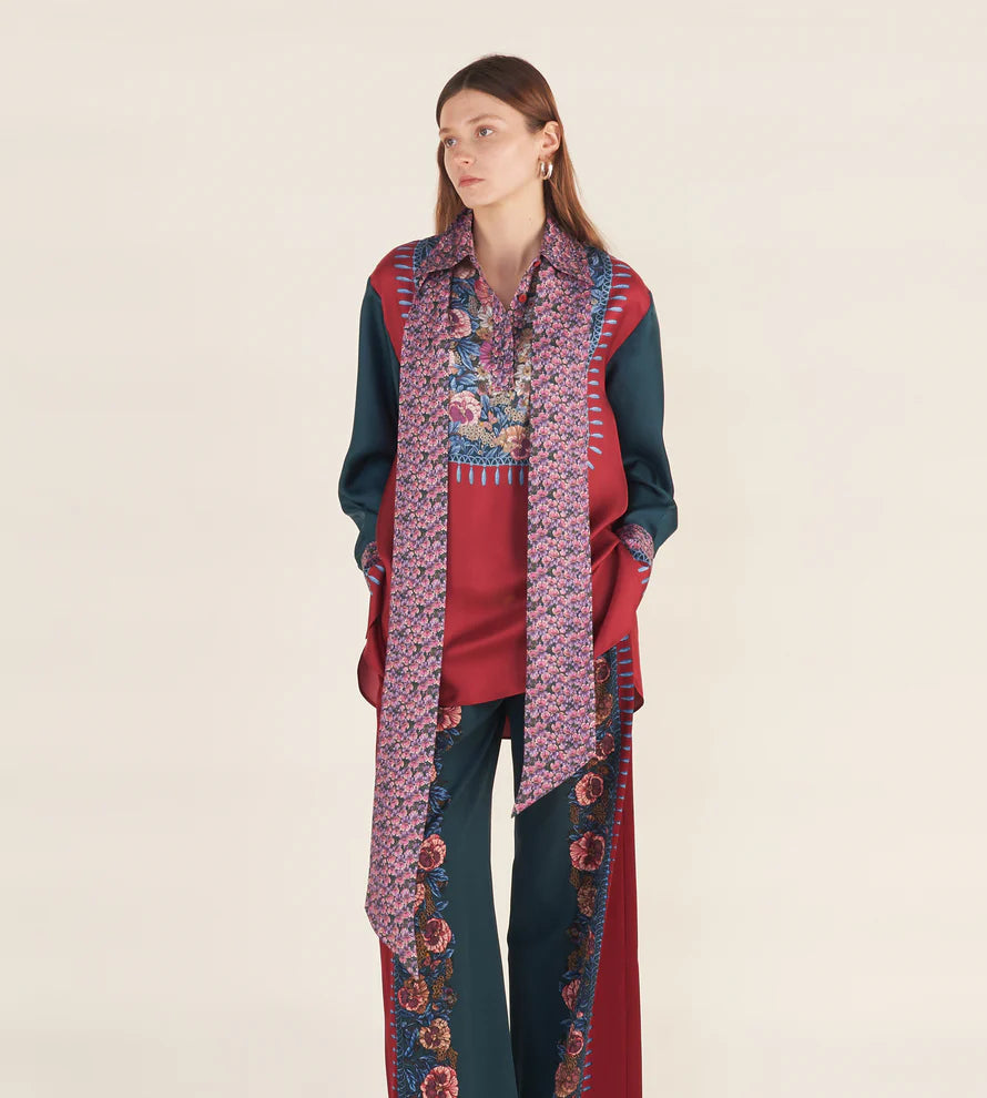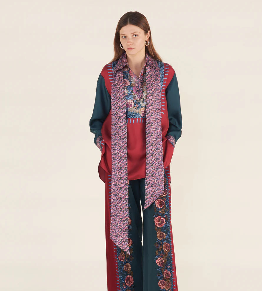 Blouse with a Henley-style front opening and buttons covered in solid-colour silk jacquard, featuring statement cuffs. Removable fabric scarf attached through a loop at the centre back of the collar. Placed print on the garment. Oversized fit.