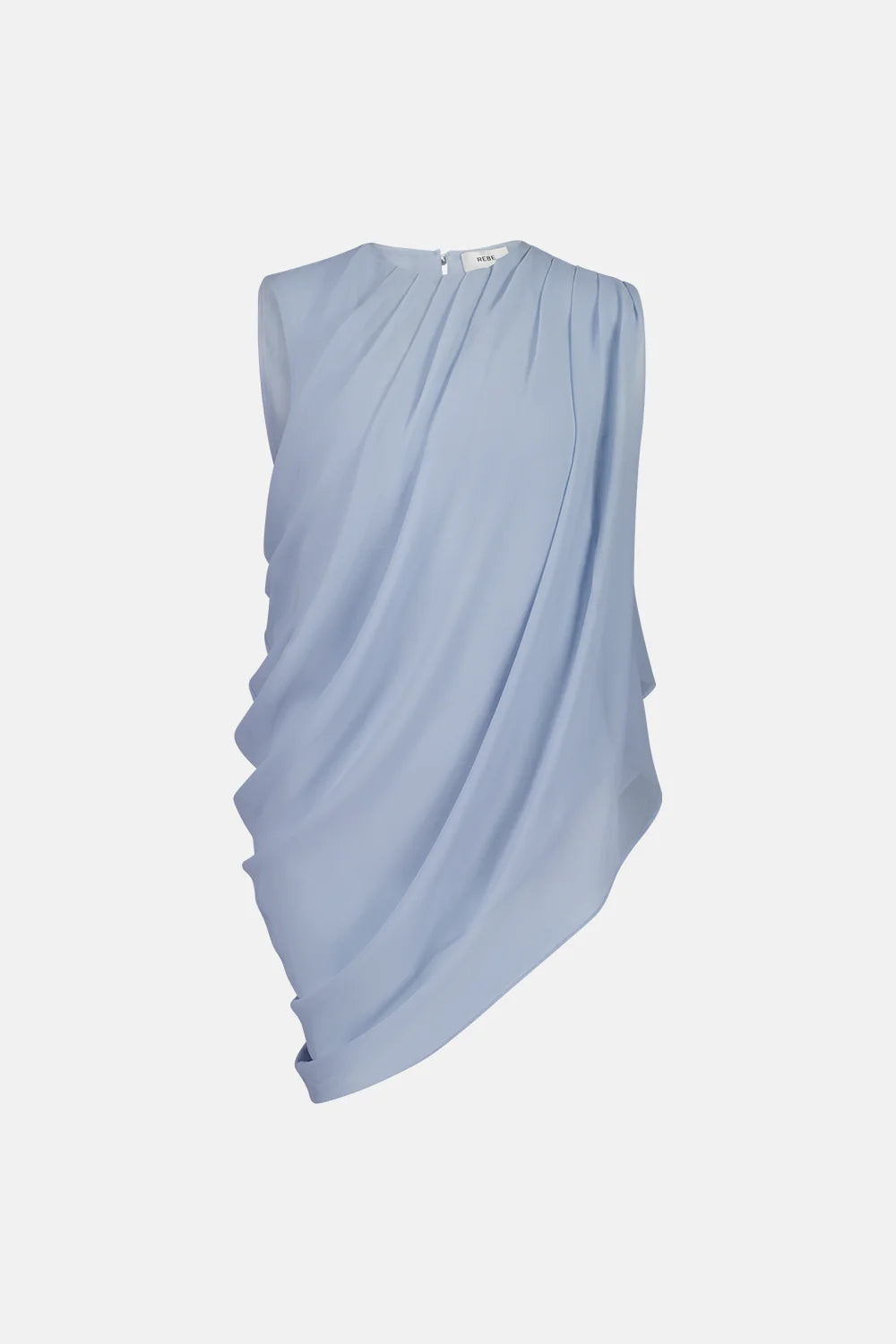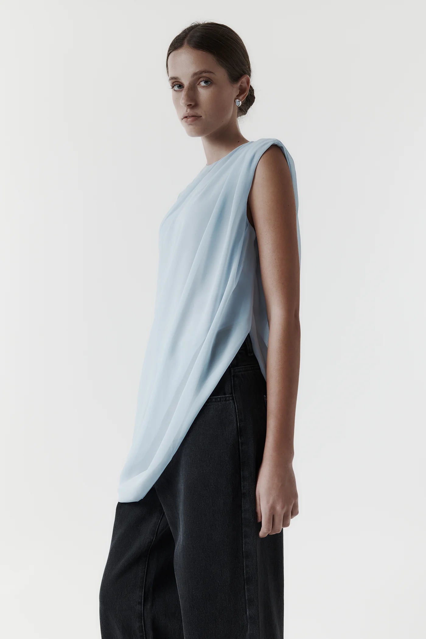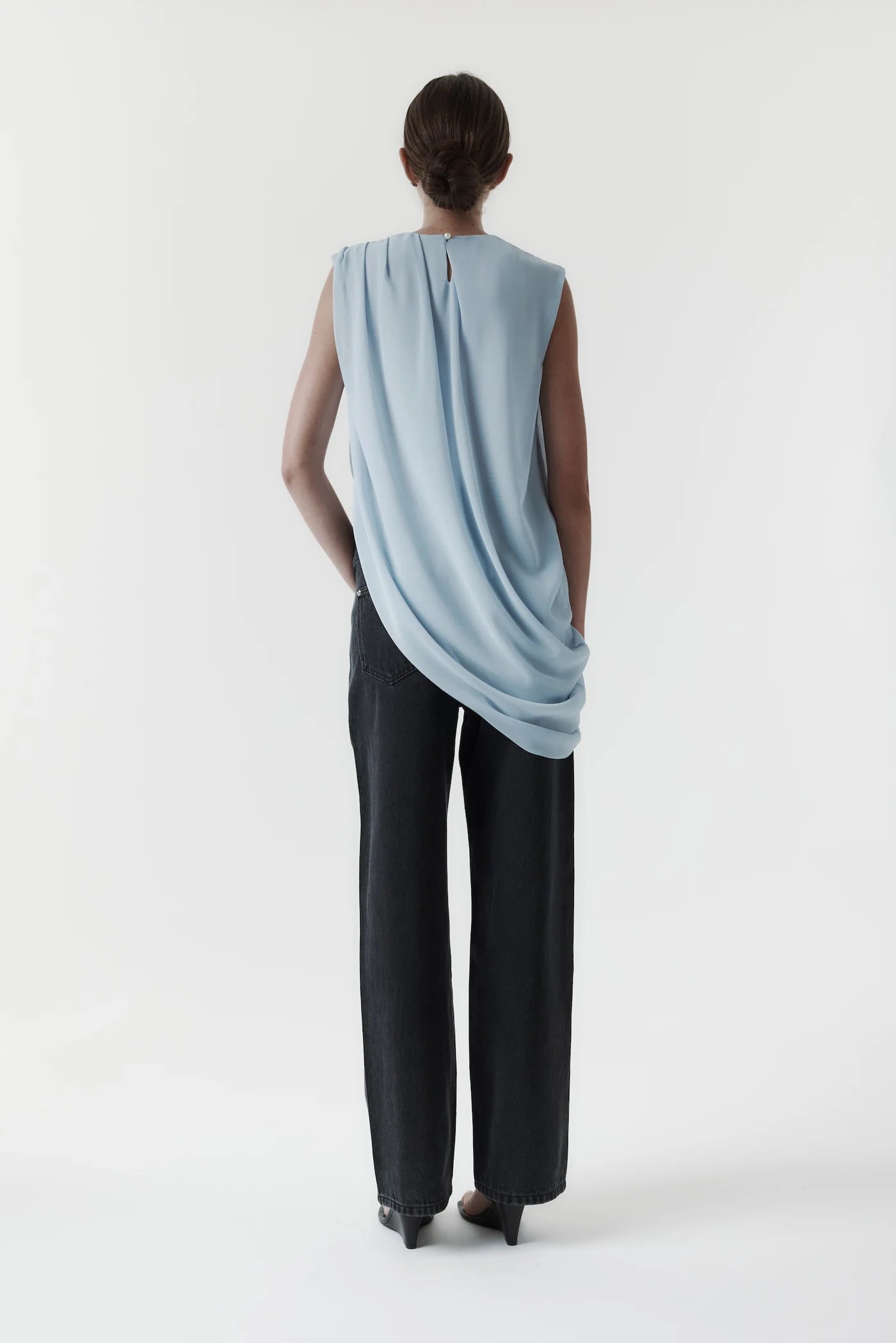 Crafted from lightweight crepe with a soft, fluid hand feel, the Draped Top features an asymmetric silhouette with delicate pleating at the neckline and a cascading drape through the body for an effortlessly elegant finish.