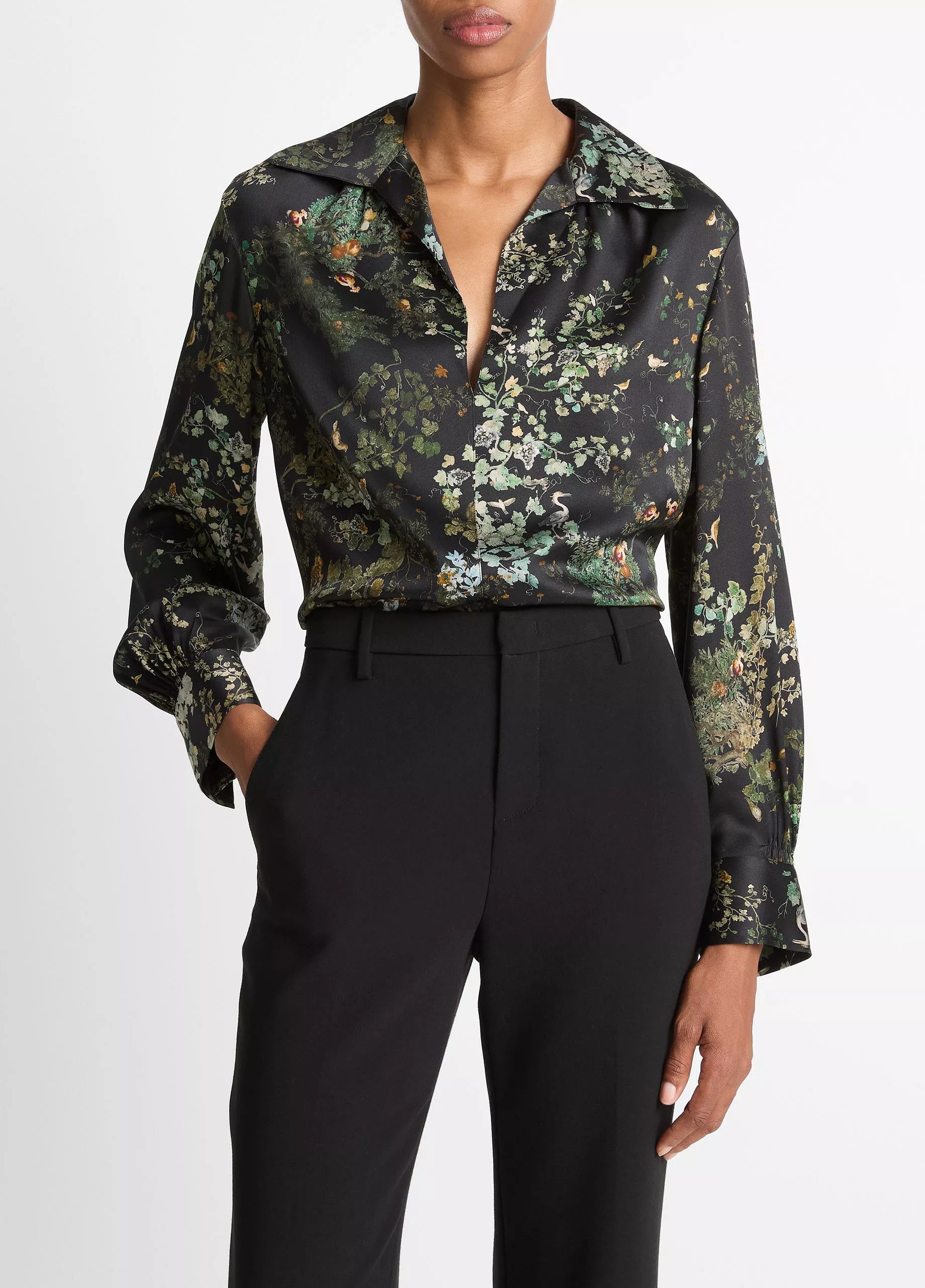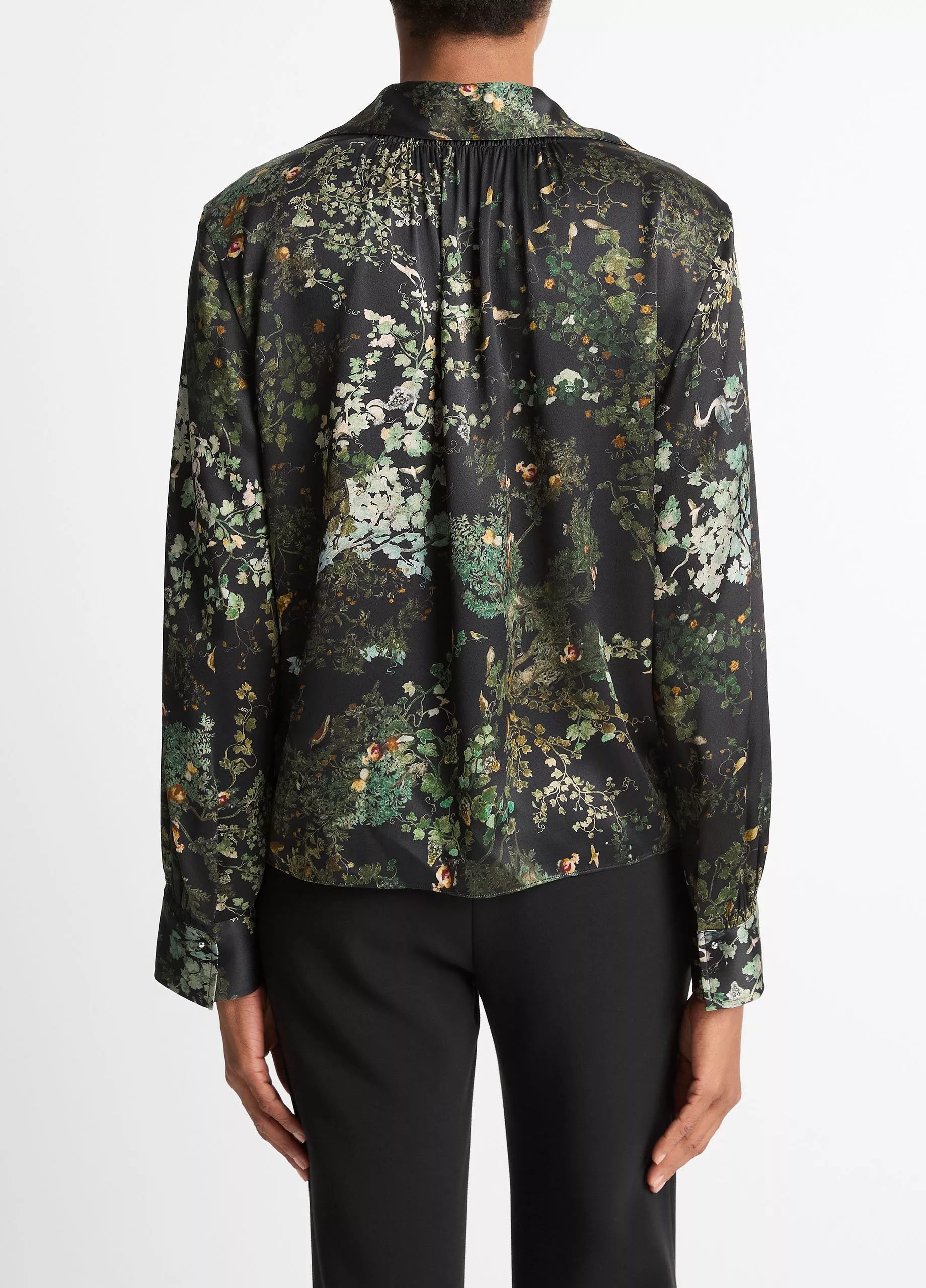 Hints of romanticism pervade our lineup this season. See the smocked ruching that defines this silk satin blouse, adding soft volume to the undercollar, sleeves and nape. Pay close attention also to that grape vine print — you might spy a few whimsical surprises (think: more than one species of bird) sprinkled throughout.