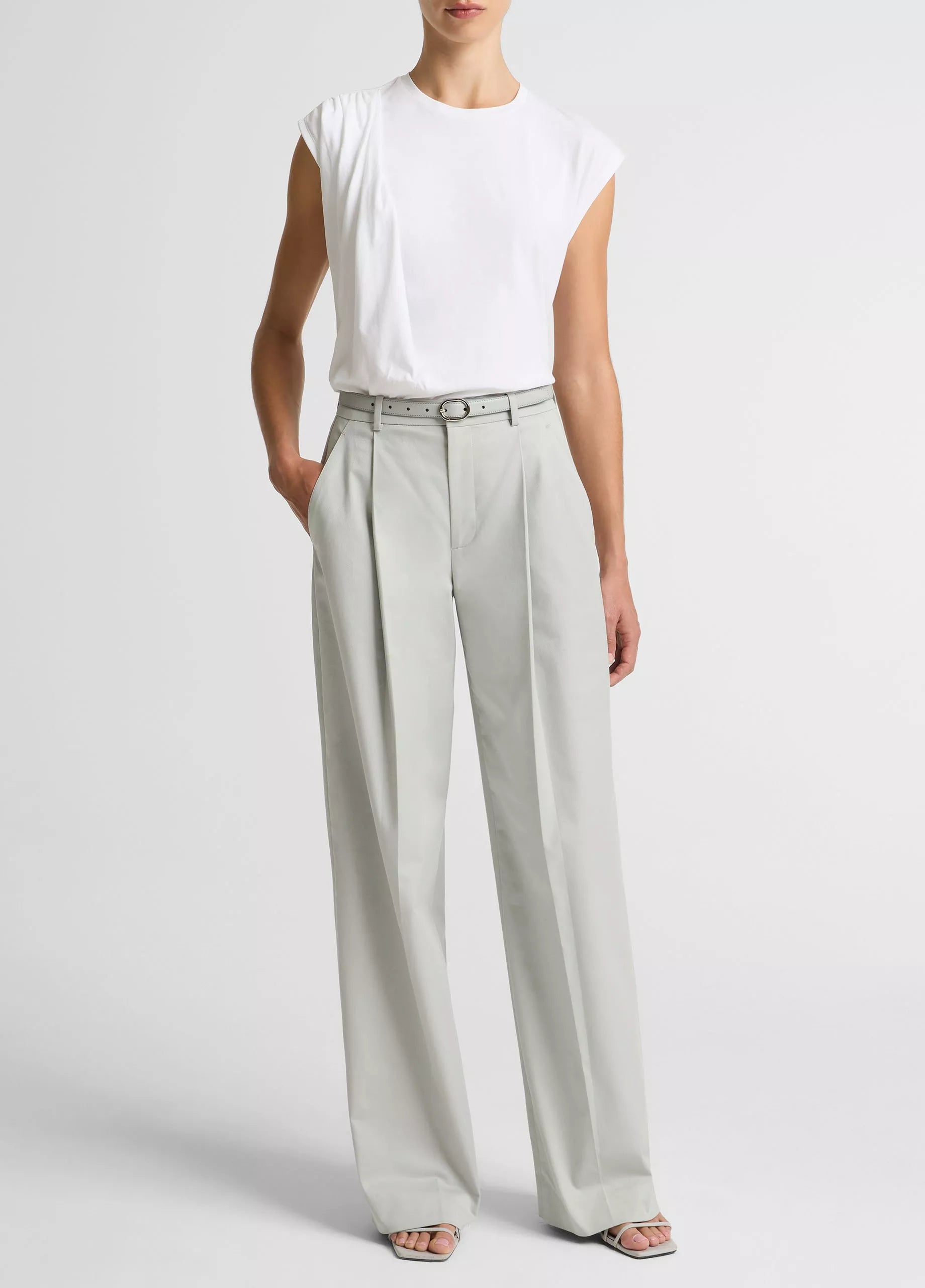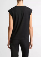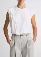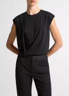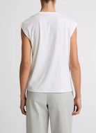 A defined tee by gentle gathering at the shoulder, which creates a soft drape down the side for a modern take on the everyday silhouette. It's made from an ultra-soft Pima cotton-blend jersey with a lighter weight that will seamlessly shift into warmer spring days.