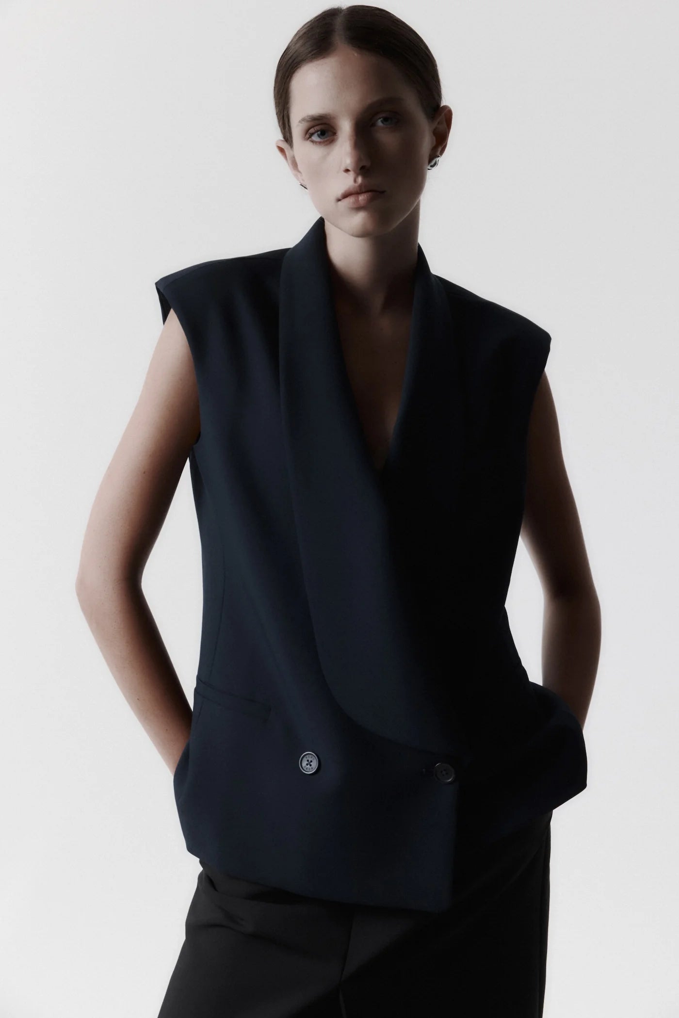 The Long Lapel Vest is crafted in our signature stretch suiting, featuring an elongated silhouette with statement lapels and a double-breasted front. Slightly tapered at the waist and balanced with internal shoulder padding, it offers a structured yet modern silhouette.