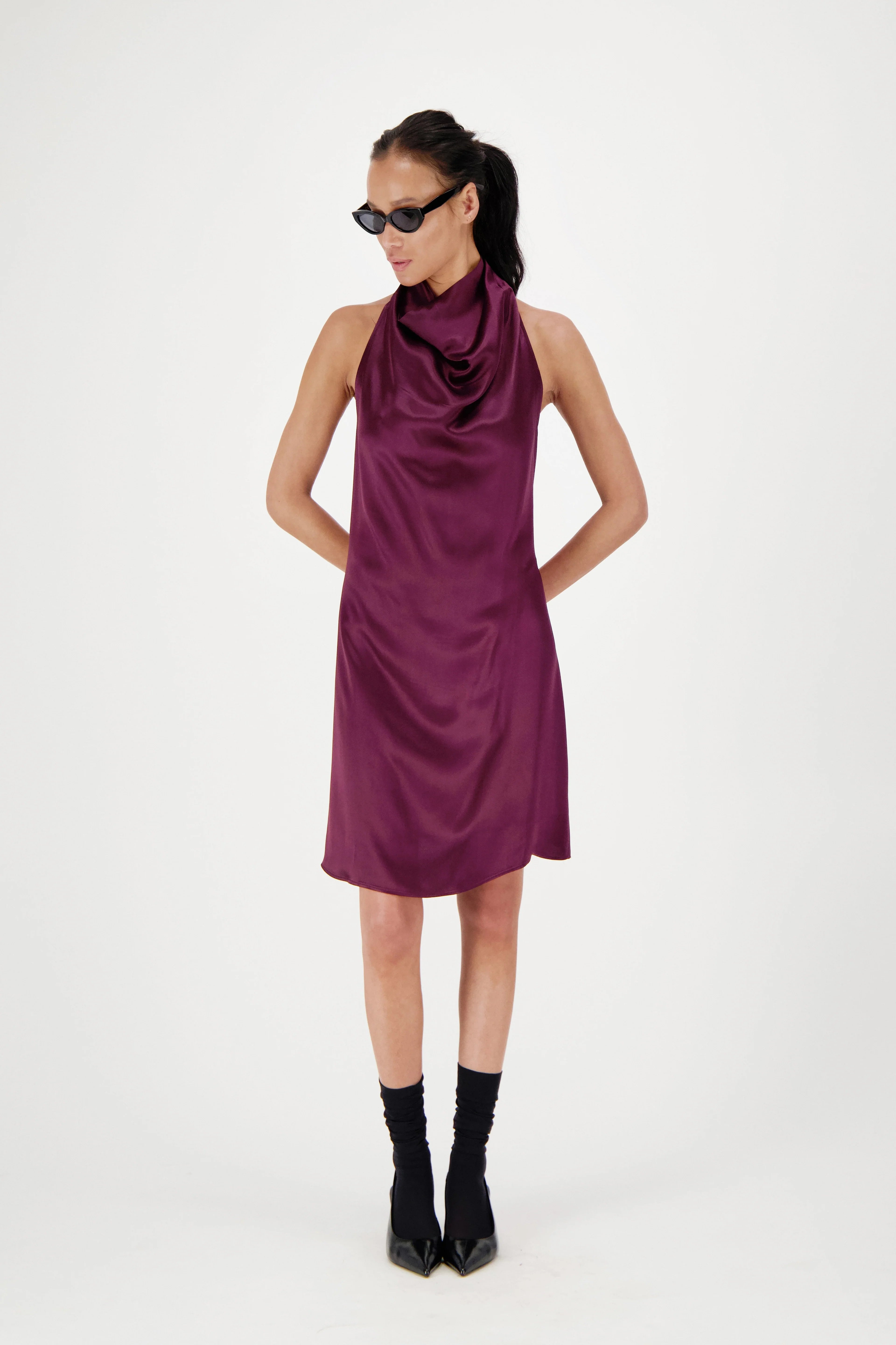 Mini dress in viscose with halter neck and back closure at the nape. Open back, relaxed silhouette. Fits true to size.