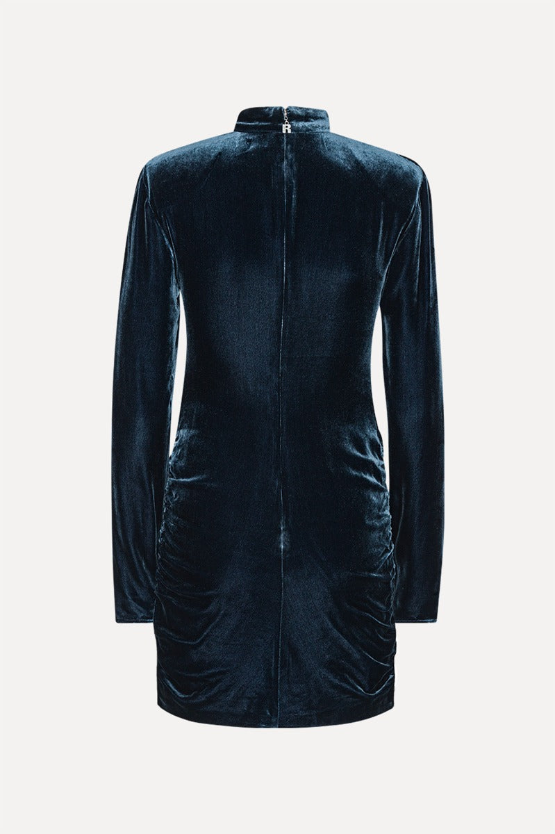 silk velvet ls mini dress dark blue is crafted from soft velvet with long sleeves and a high neckline. the dress features light shoulder structure and subtle pleats at the front neckline. the silhouette is fitted with flattering ruching along the sides and a concealed back zip.