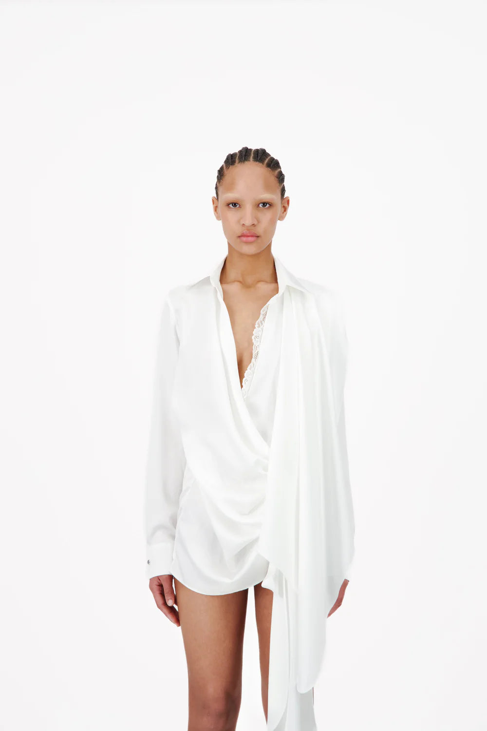 Crafted in silky satin with a relaxed fit, this statement mini dress combines effortless elegance with couture-inspired details. Designed with long sleeves, soft front draping, and a side tie knot for a flattering silhouette. The asymmetrical lace insert, made from original Calais lace, adds a touch of French sophistication.