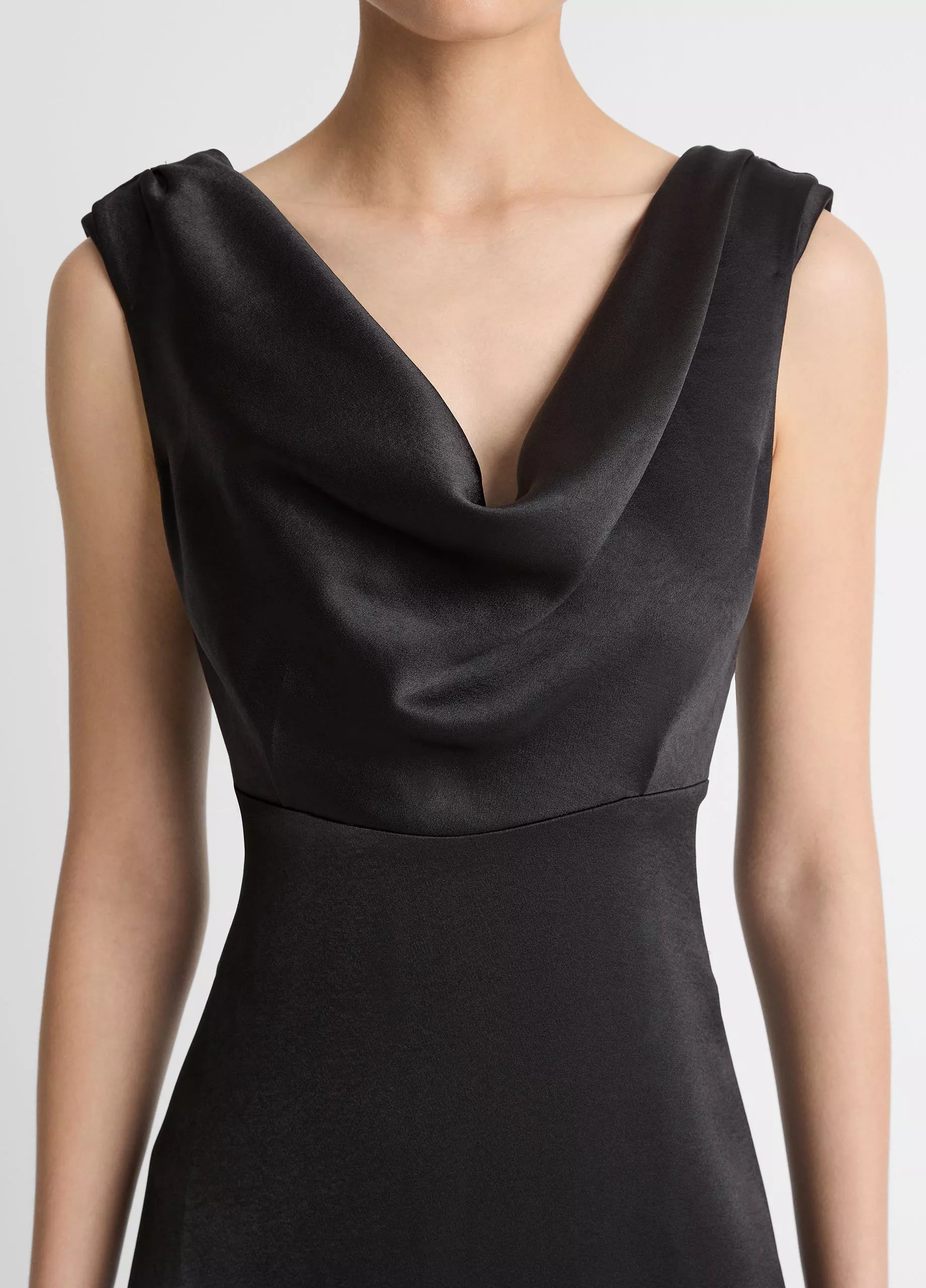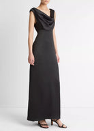 The beauty of this cowl-neck maxi is its clean, understated elegance, which allows it to transcend an abundance of occasions. The floor-sweeping silhouette is cut on the bias from lustrous satin to drape down the form with fluidity.