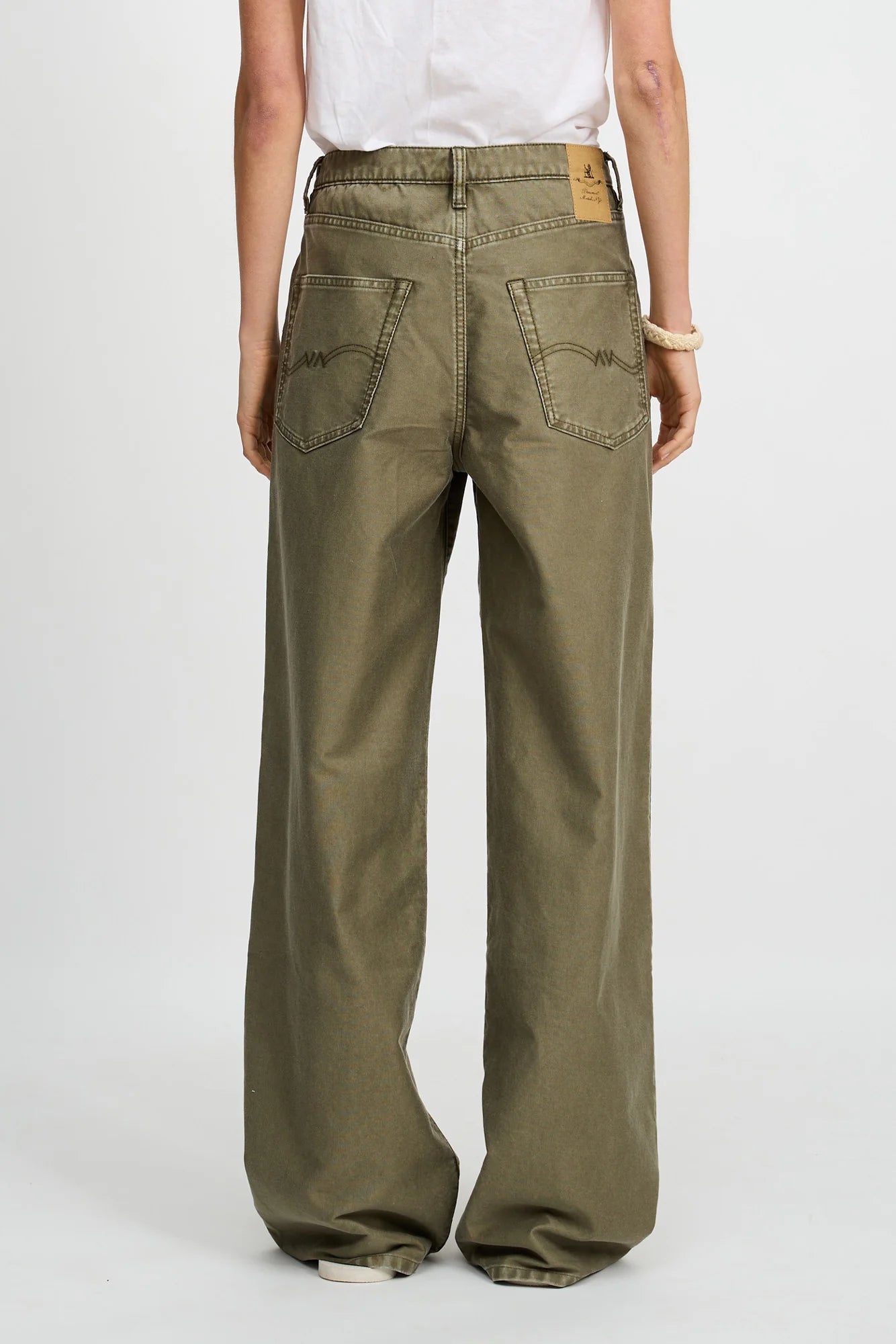 Mid-rise jean with a full-length, wide leg. Classic five-pocket construction. Cut in olive green Bedford cord.