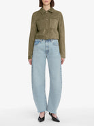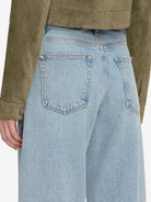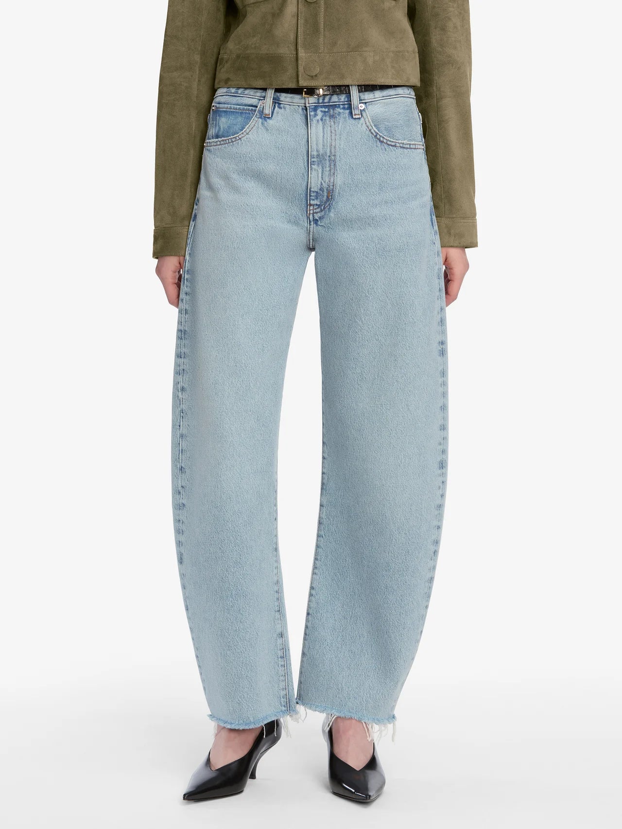 best-selling Bubble, now with a shorter 27" inseam. The exaggerated take on the trending barrel silhouette is a unique fit and instant closet necessity. With a flattering high rise, these jeans have a curved outseam for a playful bubble effect. Note the light blue wash and raw, fringed hem for a pre-loved look.