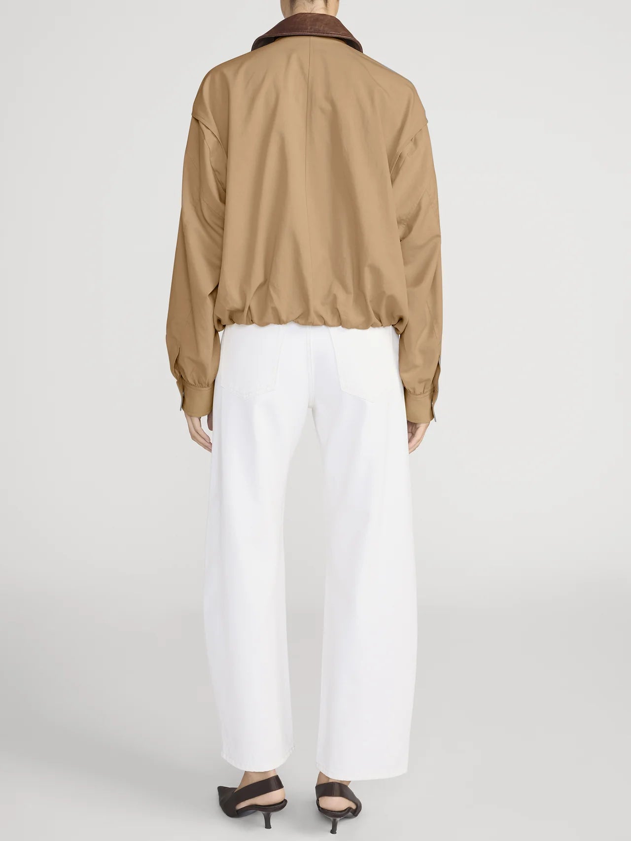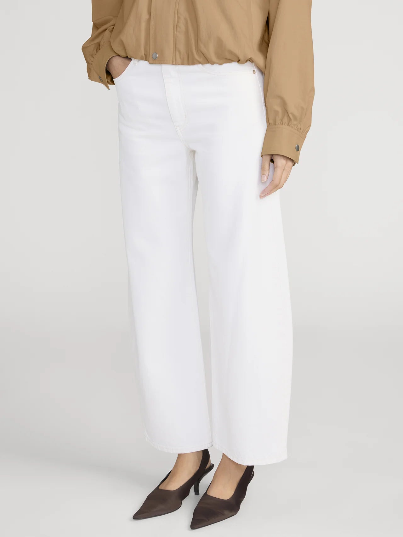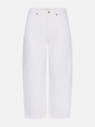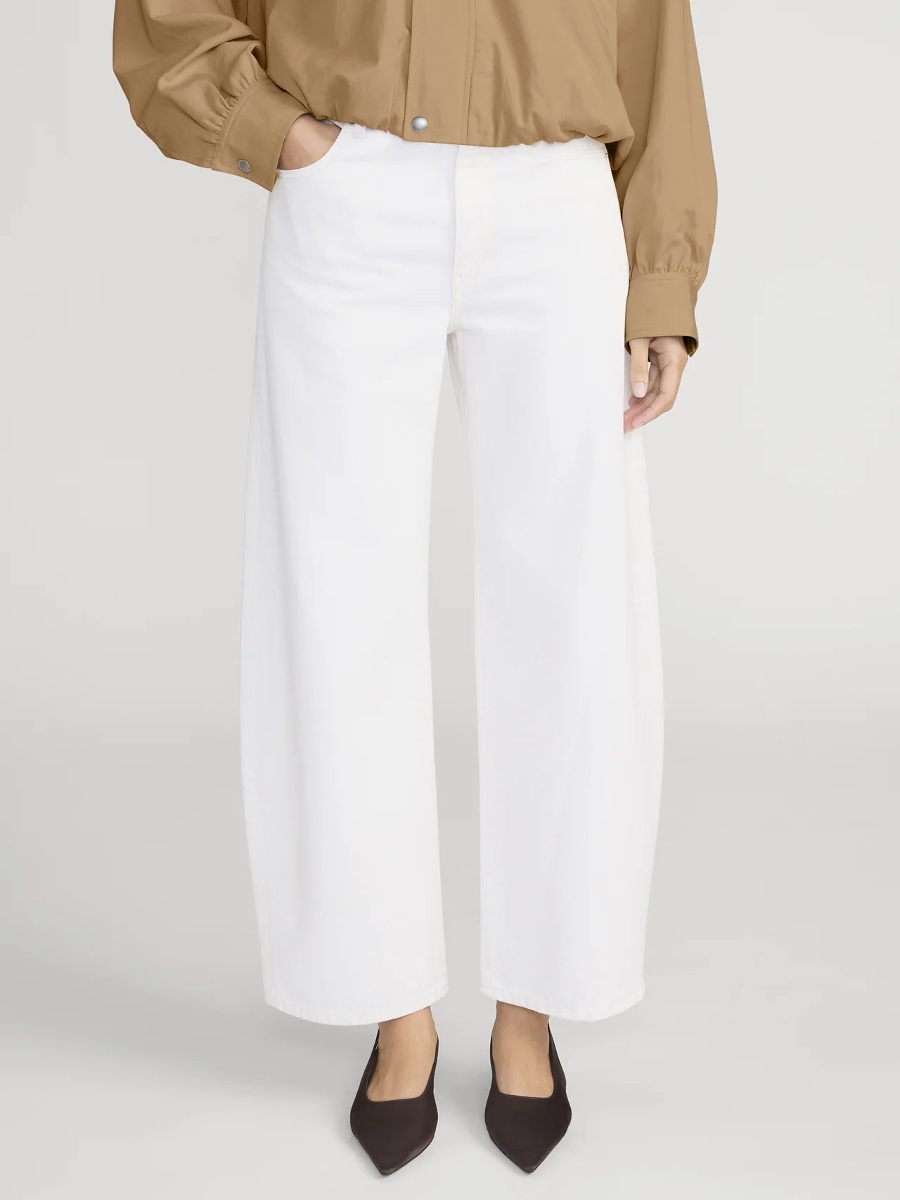 best-selling Bubble, now with a shorter 27" inseam. The exaggerated take on the trending barrel silhouette is a unique fit and instant closet necessity. With a flattering high rise, these jeans have a curved outseam for a playful bubble effect. Note the light blue wash and raw, fringed hem for a pre-loved look.