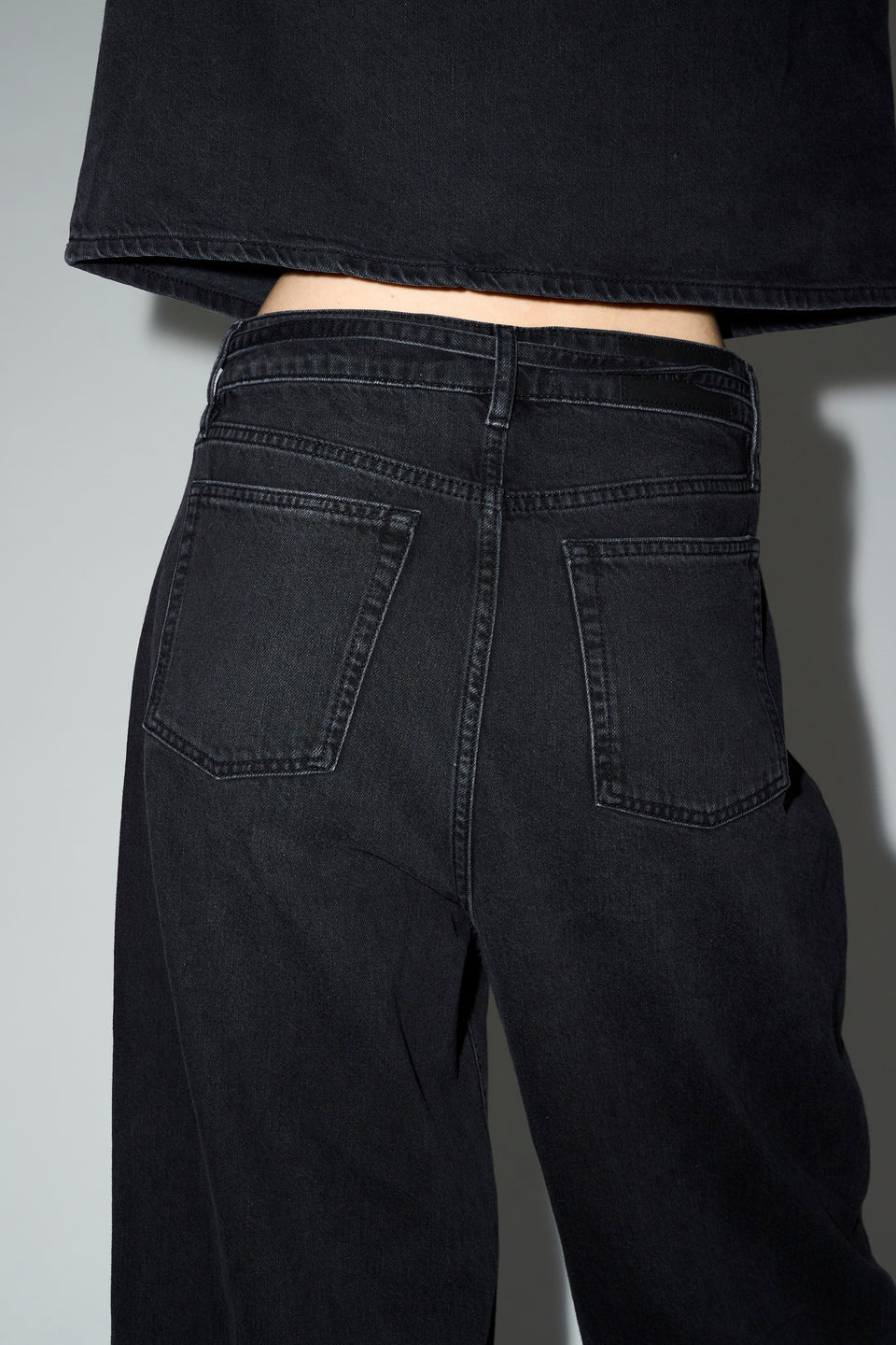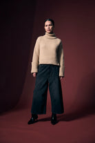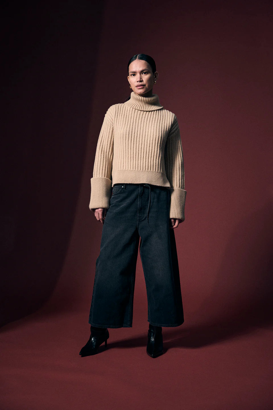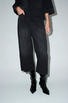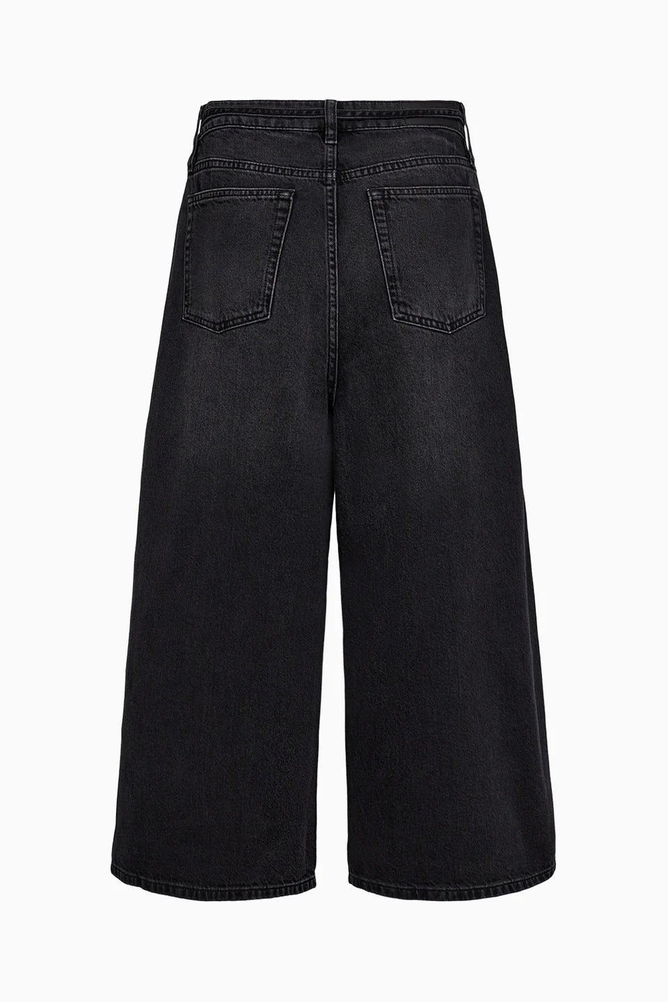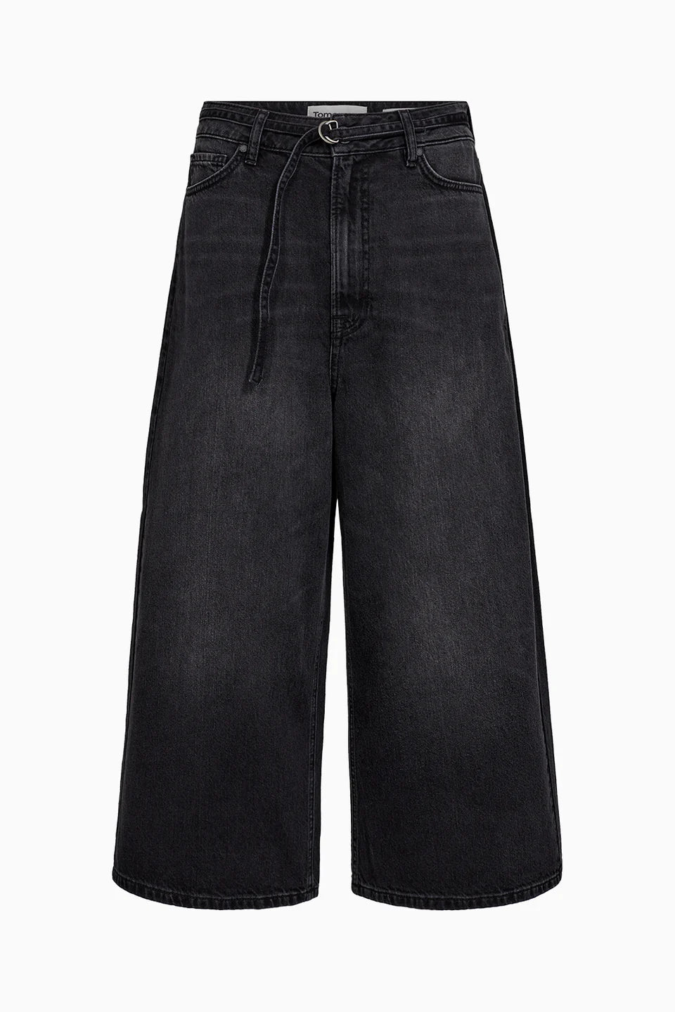 High-waisted culottes with a wide cropped leg. Cut from structured cotton denim in a soft black wash. Features tonal seams and a matching denim tie belt for a minimal utility expression.