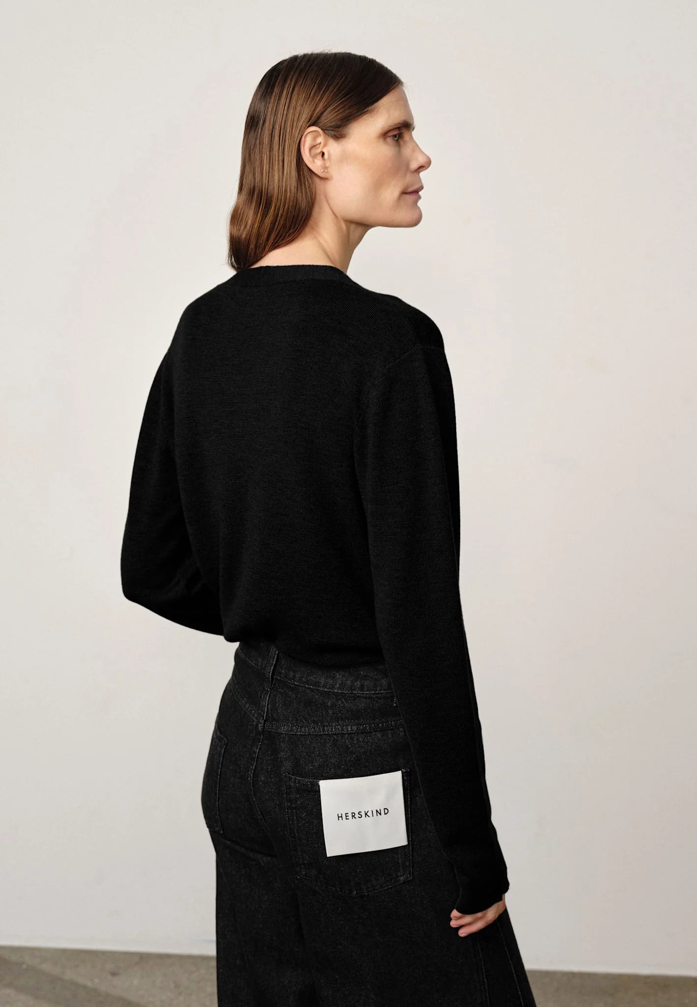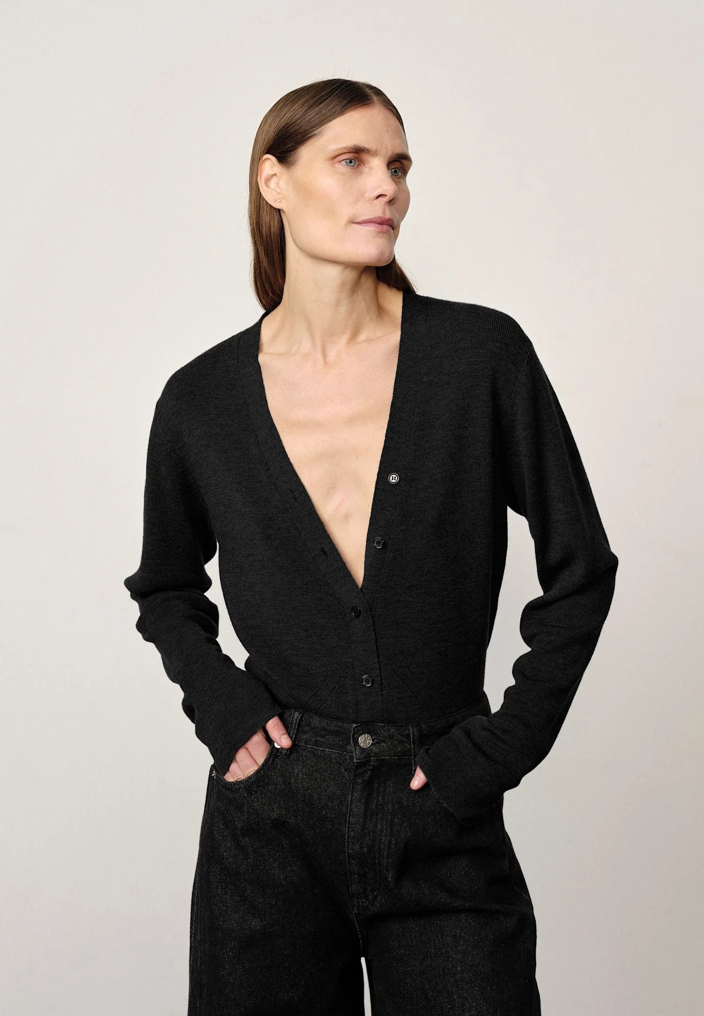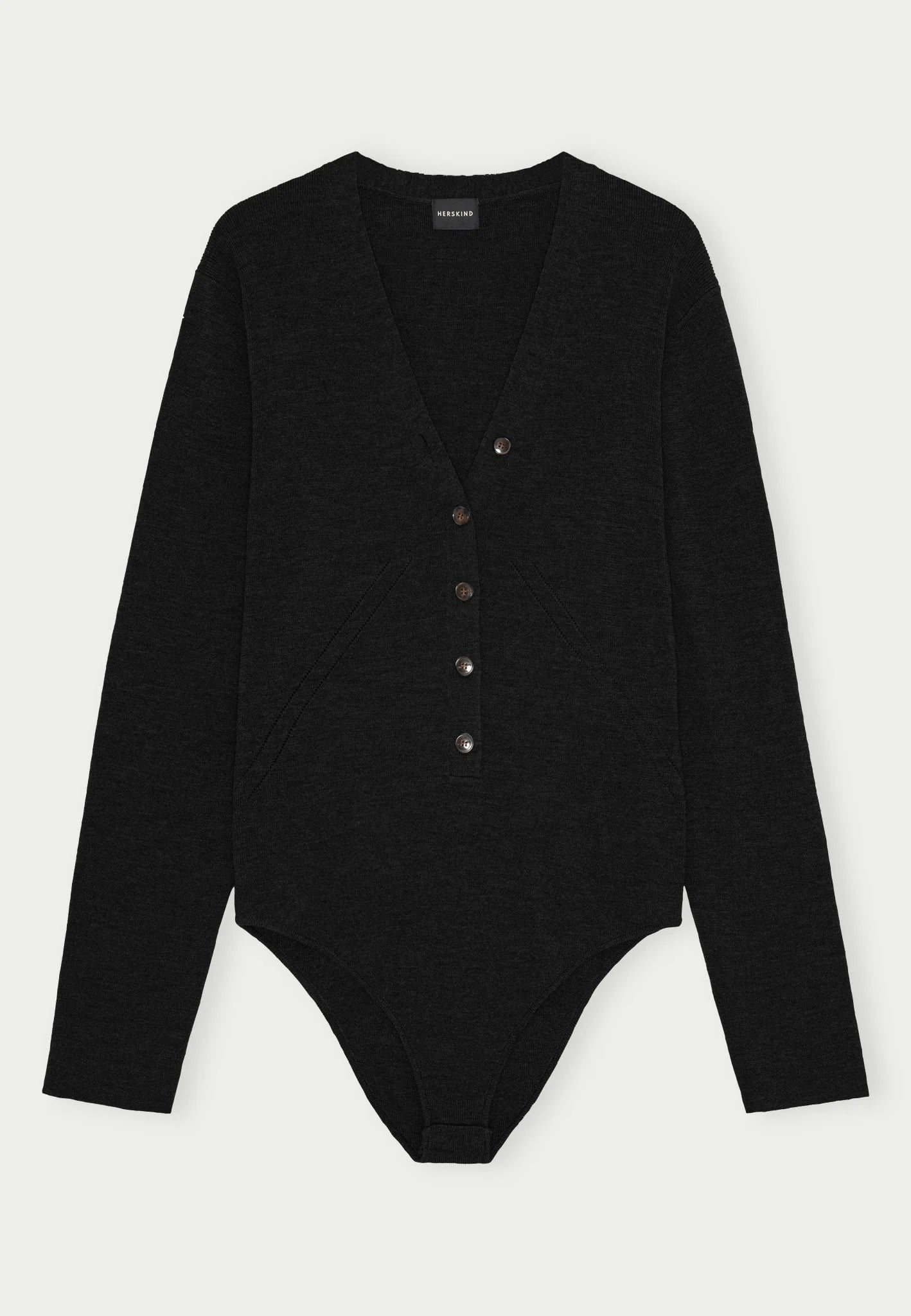 Introducing the Knit Bodystocking: A long-sleeve bodysuit featuring a deep V-neckline and a front button closure.