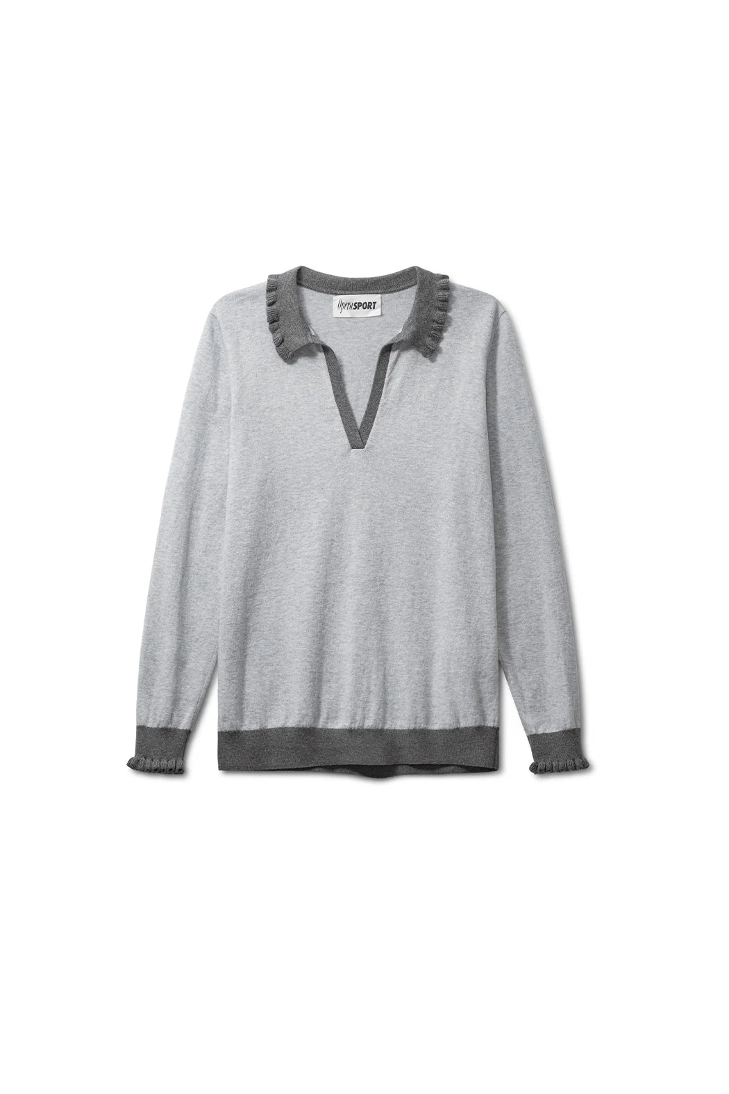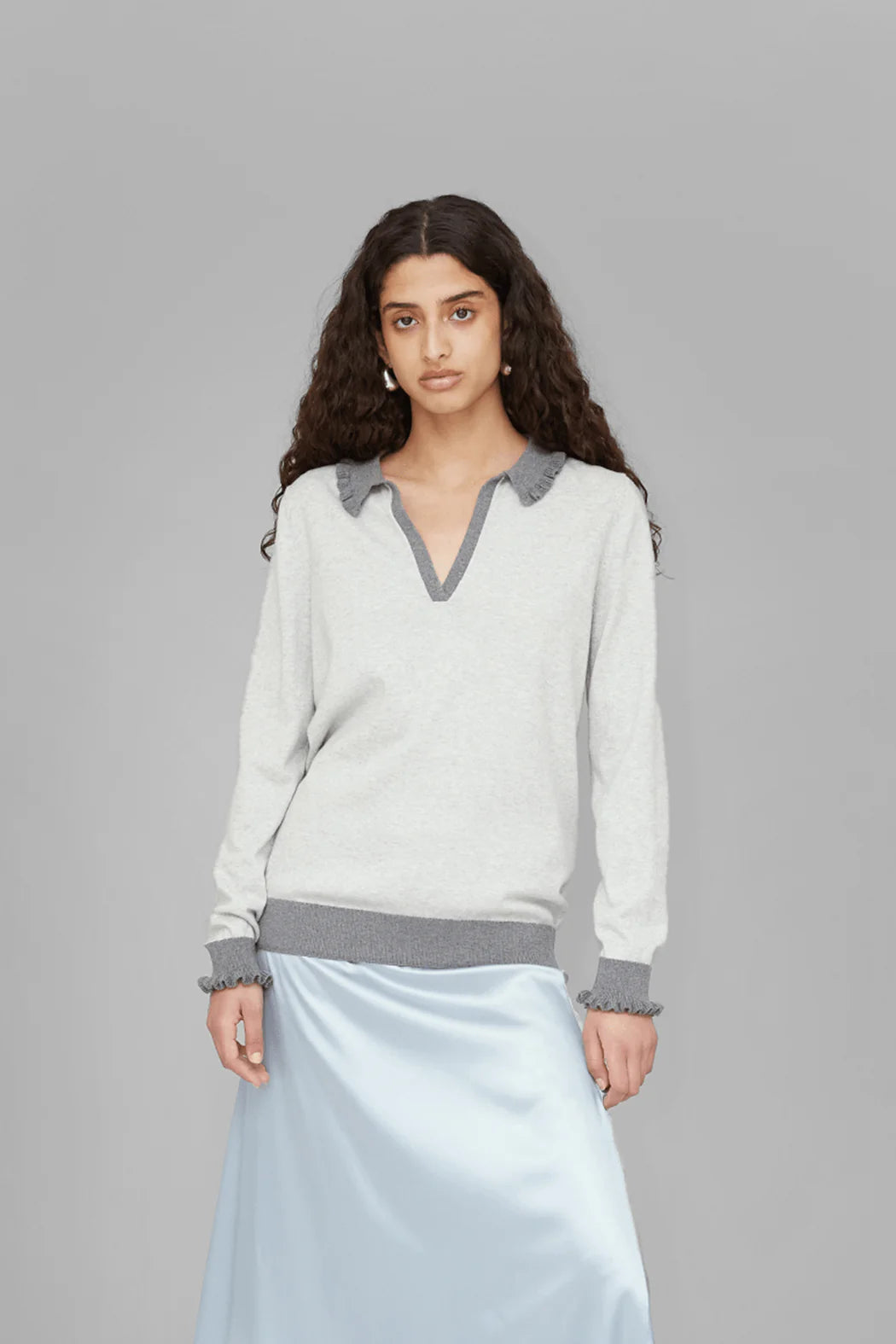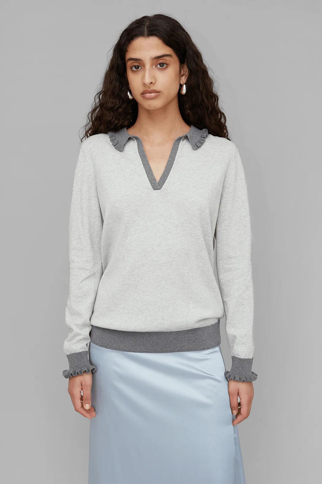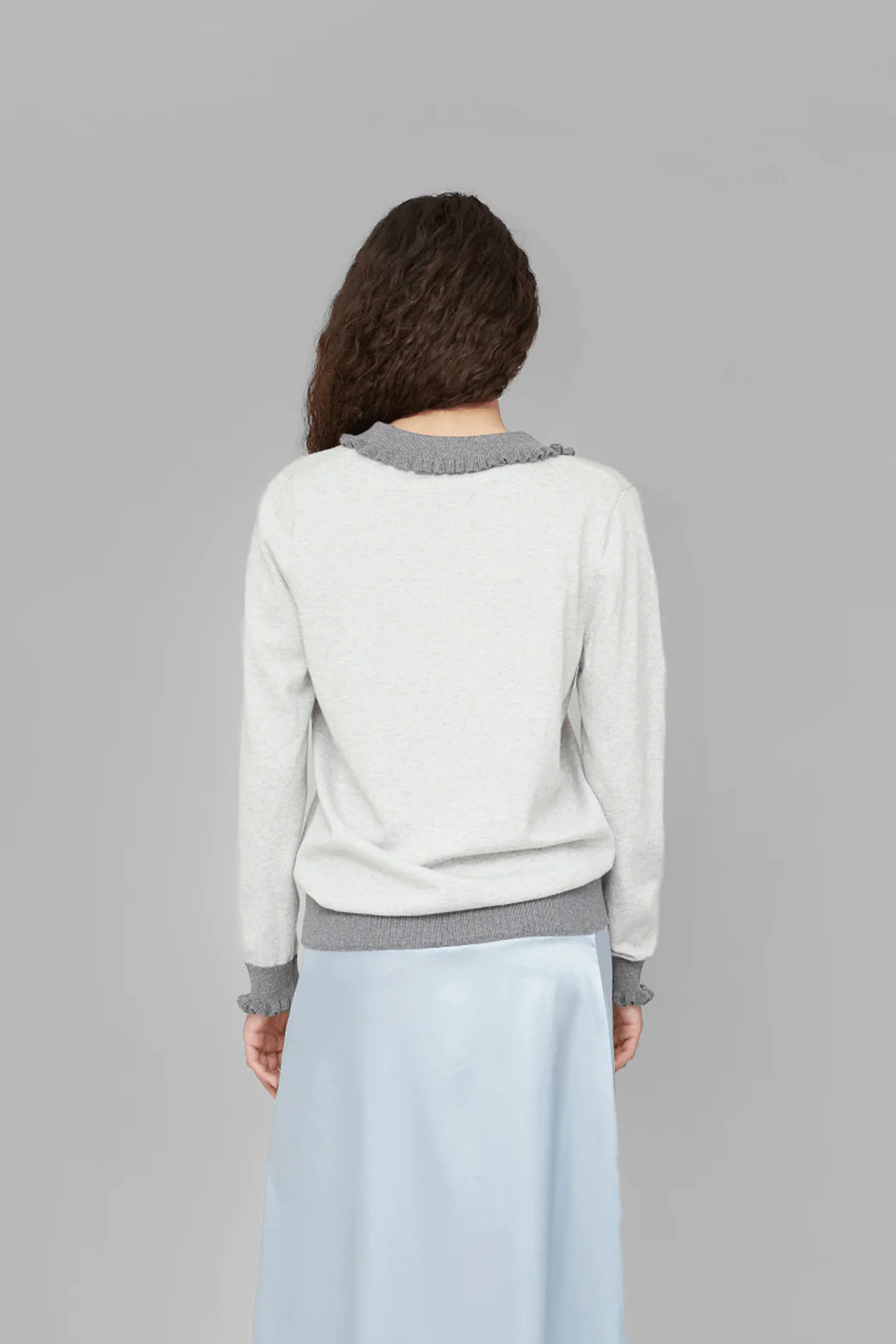 crafted from 30% RWS wool and 70% organic cotton. Designed in grey, it features a deep V-neckline with a contrasting ribbed collar and cuffs. Subtle ruffle edges add a feminine touch to the relaxed silhouette, making it an easy everyday knit with refined detailing.
