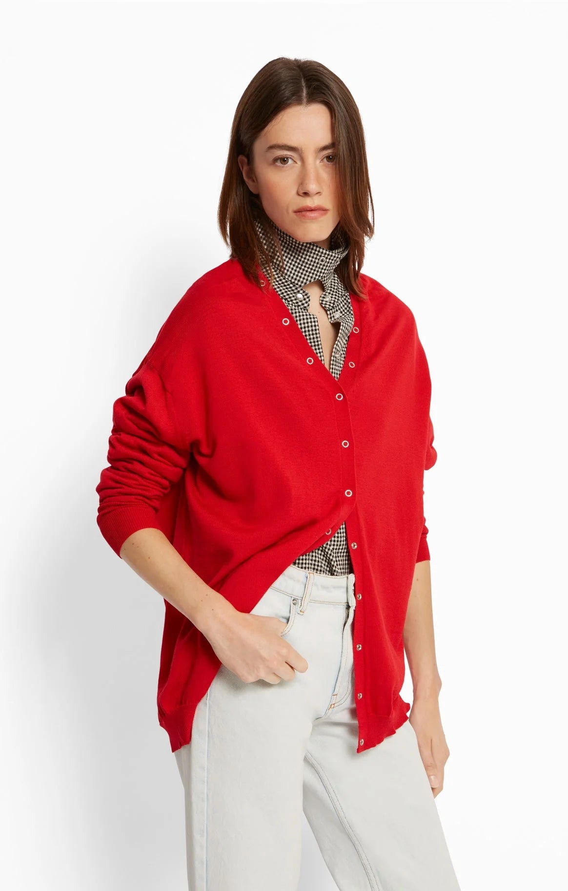 The V-neck cardigan features a relaxed, fluid silhouette and is a new addition to the knitwear collection. Its distinctive detail lies in the metallic snap buttons running along the entire edge, allowing you to fasten it according to your style.