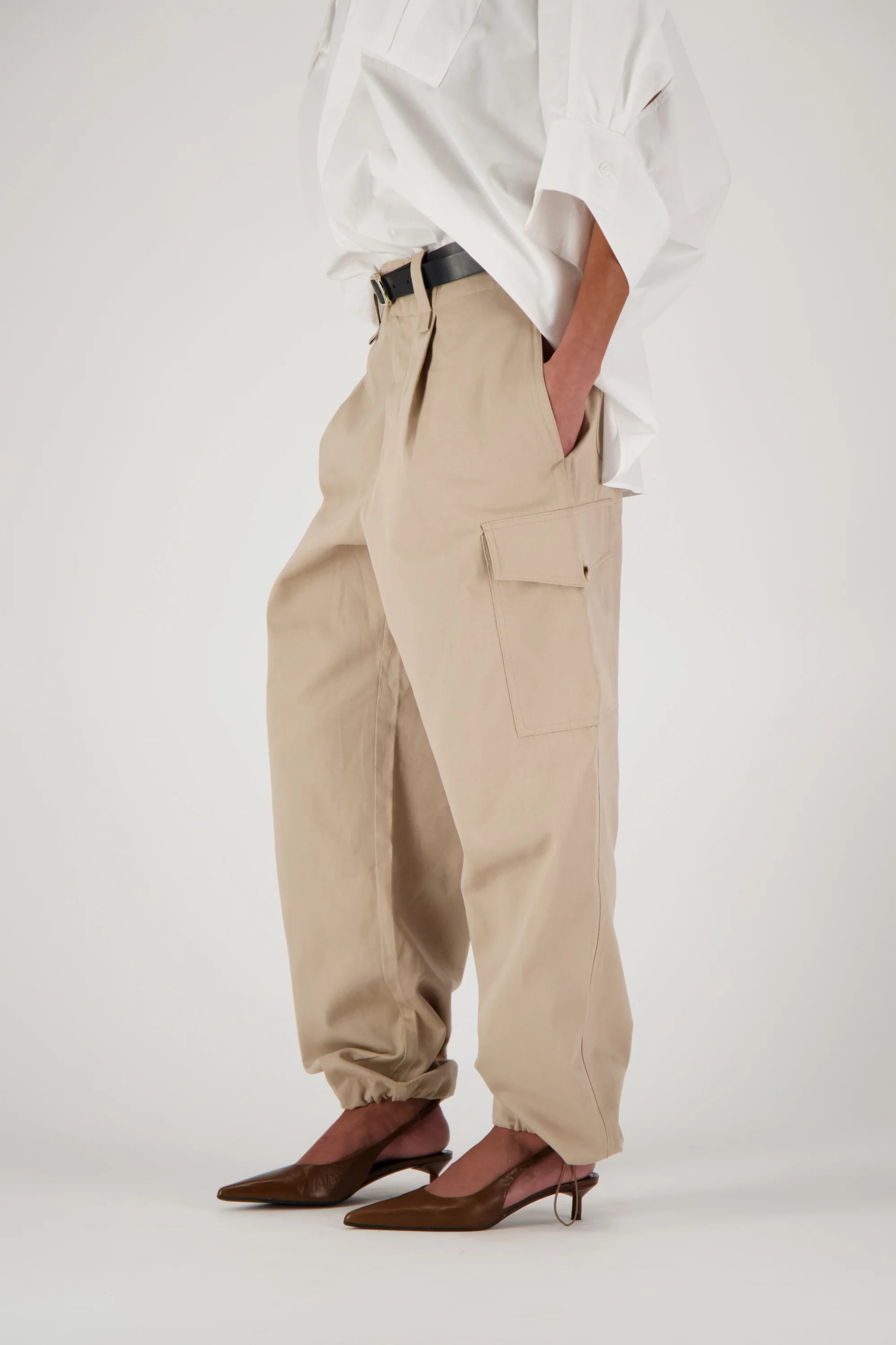 Cargo pants with front pleats, side pockets, and elastic hems.