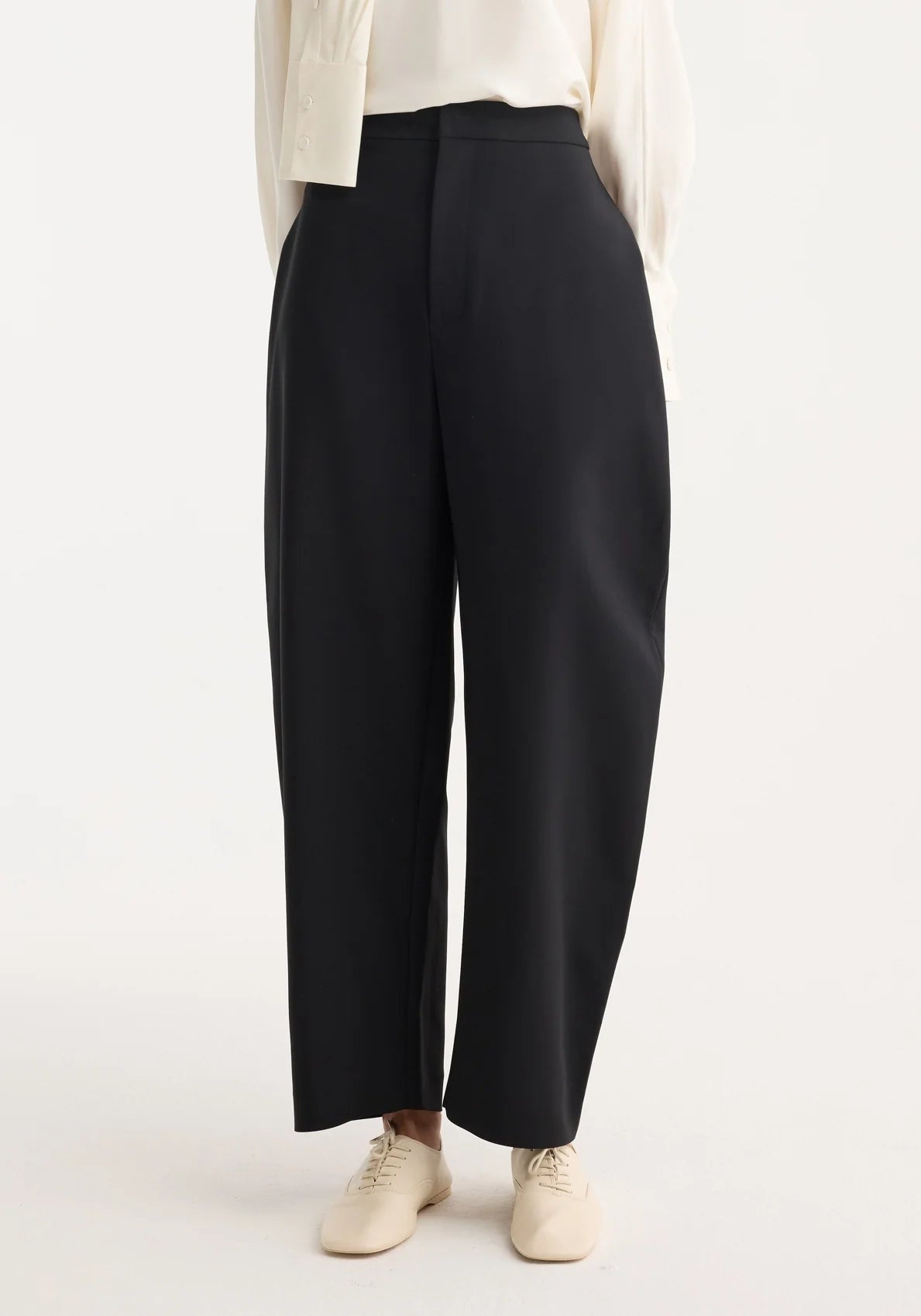 A sculptural trouser designed with a bold rounded balloon leg and high waist, creating an artful silhouette that makes an instant statement. Crafted from a softly structured viscose blend with a hint of stretch for ease and movement. A standout piece in modern tailoring.