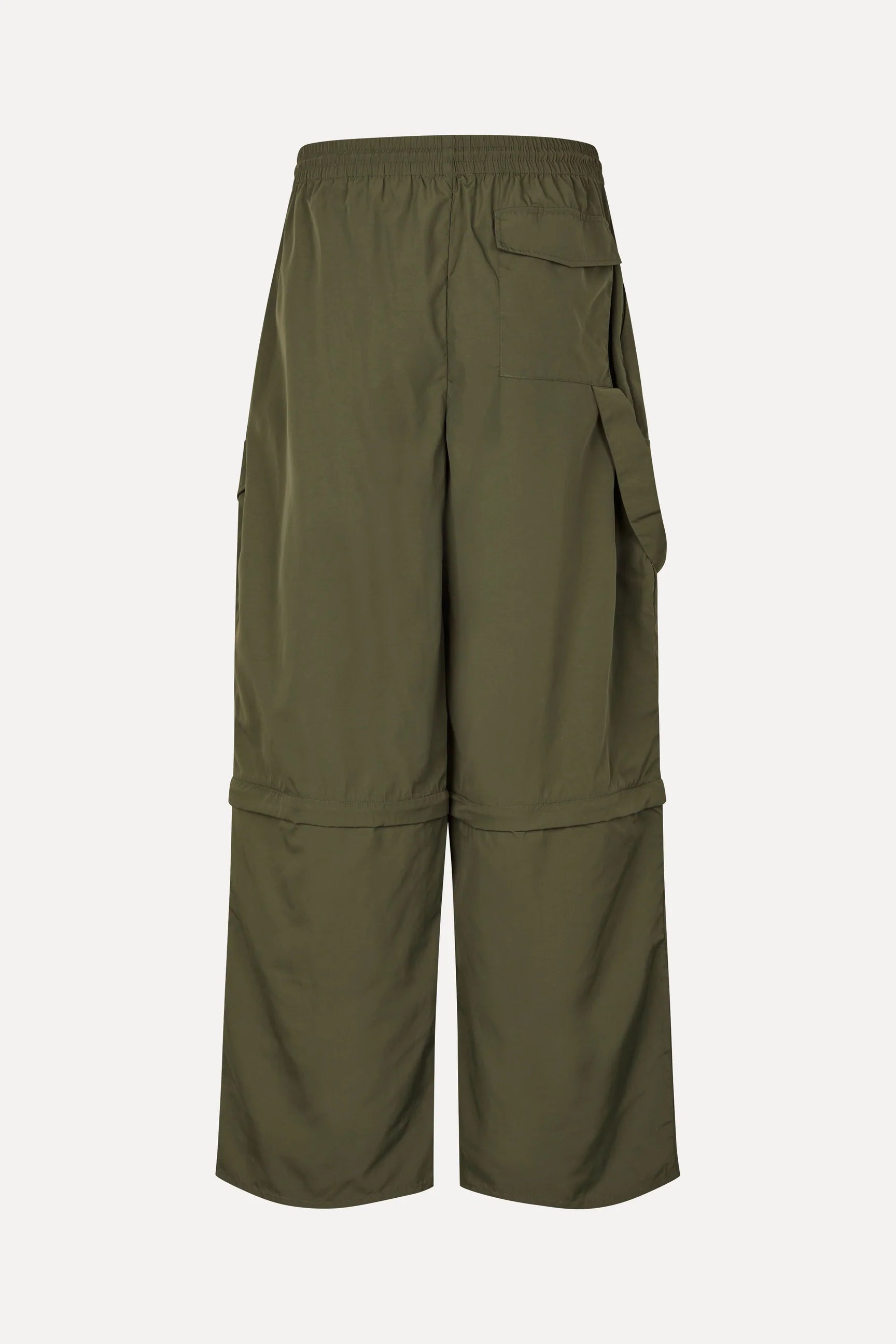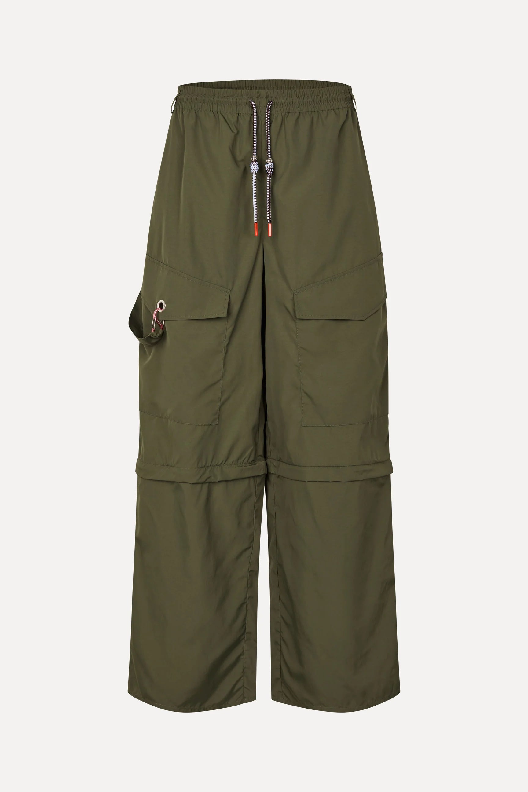 cargo-style zip-off pants in dark green lightweight fabric. designed with a relaxed fit, they can be worn full-length or as shorts. finished with an elasticated drawstring waist and utility-style pockets.