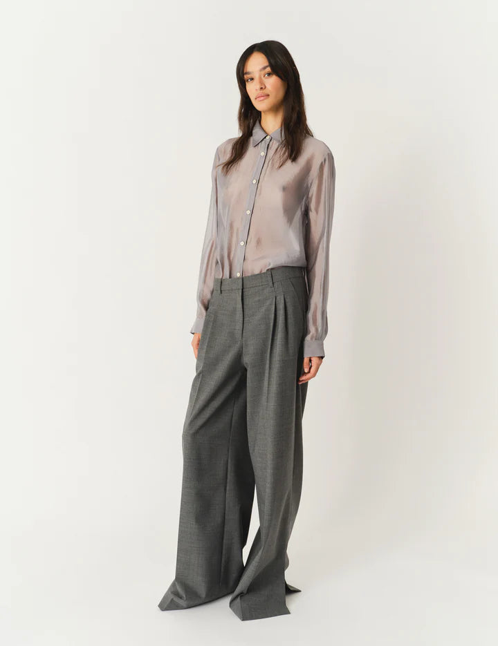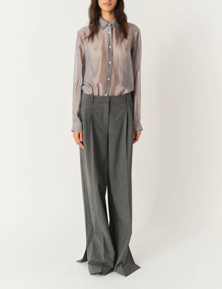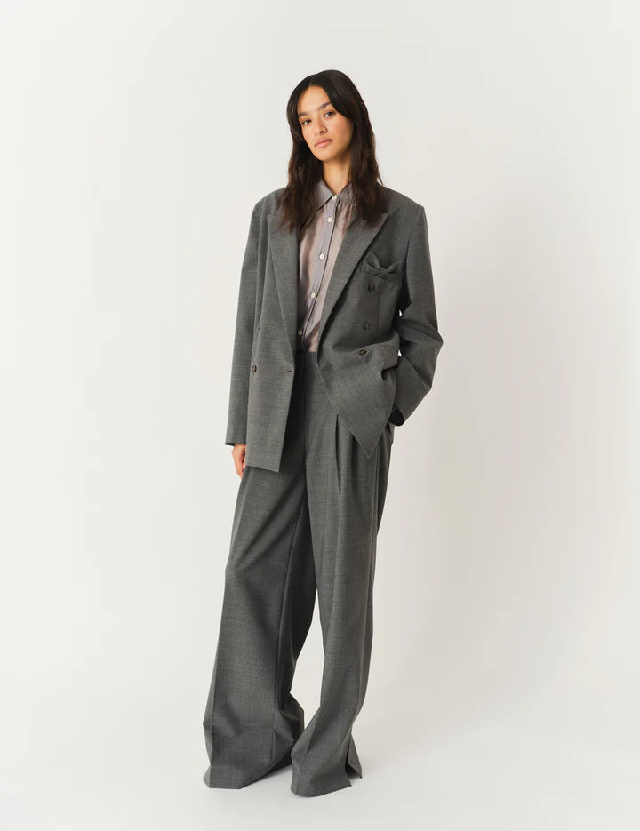 The Garment, The Grand Pants are high-waisted tailored trousers with wide legs and subtle side slits at the hem.