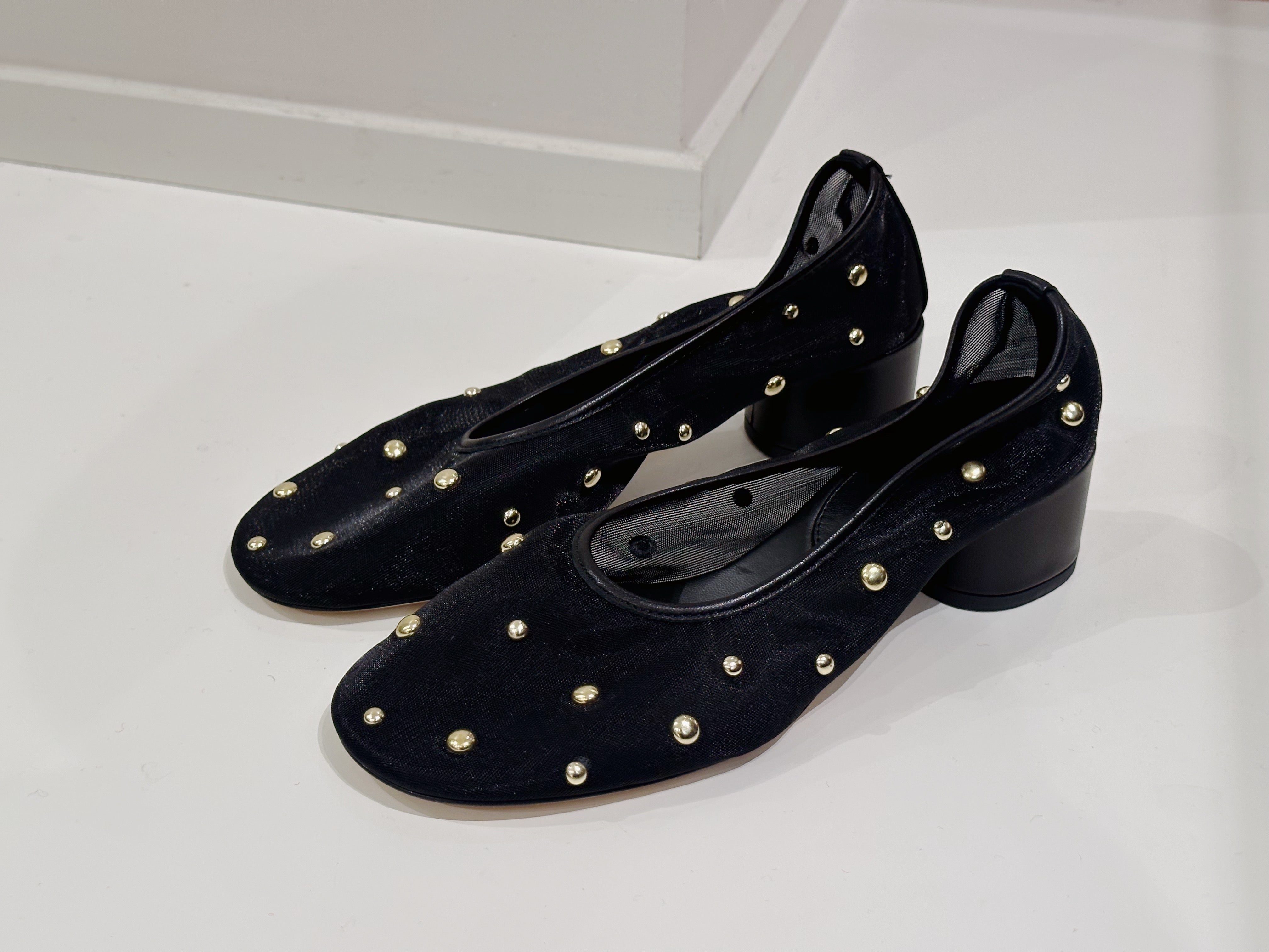 Crafted from sheer Italian mesh with studs and set on a cylindrical block heel. Leather wrapped and padded insole, buffed leather outsole and mid height leather heel.