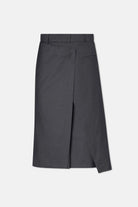 This midi skirt features a sophisticated wrap-effect front that creates clean lines and a modern silhouette. Crafted from a soft polyester-rayon blend, it combines structure with fluidity, making it a versatile piece for both casual and elevated looks. The tailored waistband and asymmetric hem add a refined, contemporary touch.