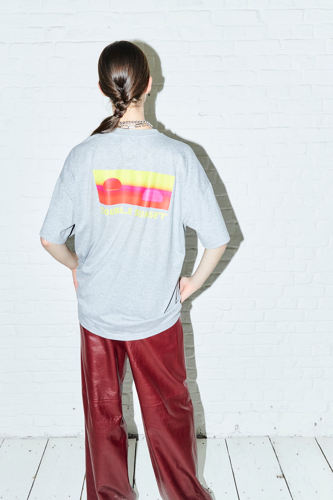 An oversized unisex T-shirt. The front features our Double Sunset logo, while the back showcases an exclusive in-house illustration of a beautiful double sunset.