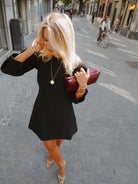 suiting flared mini dress black is crafted from structured recycled polyester and features a fitted bodice with flared hem. the design includes voluminous long sleeves and a round neckline. the back has a teardrop-shaped opening with a button closure. the dress has lining.
