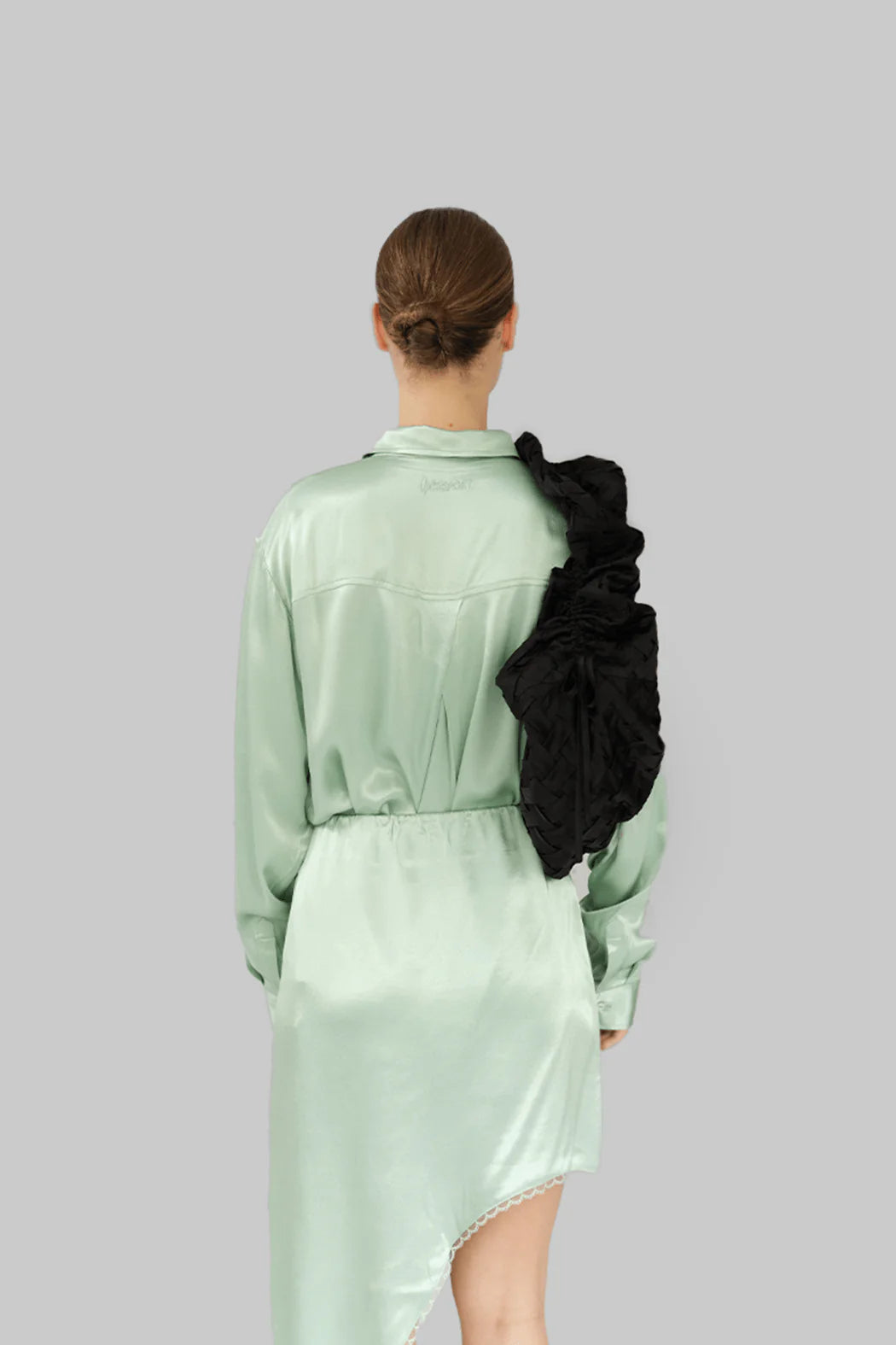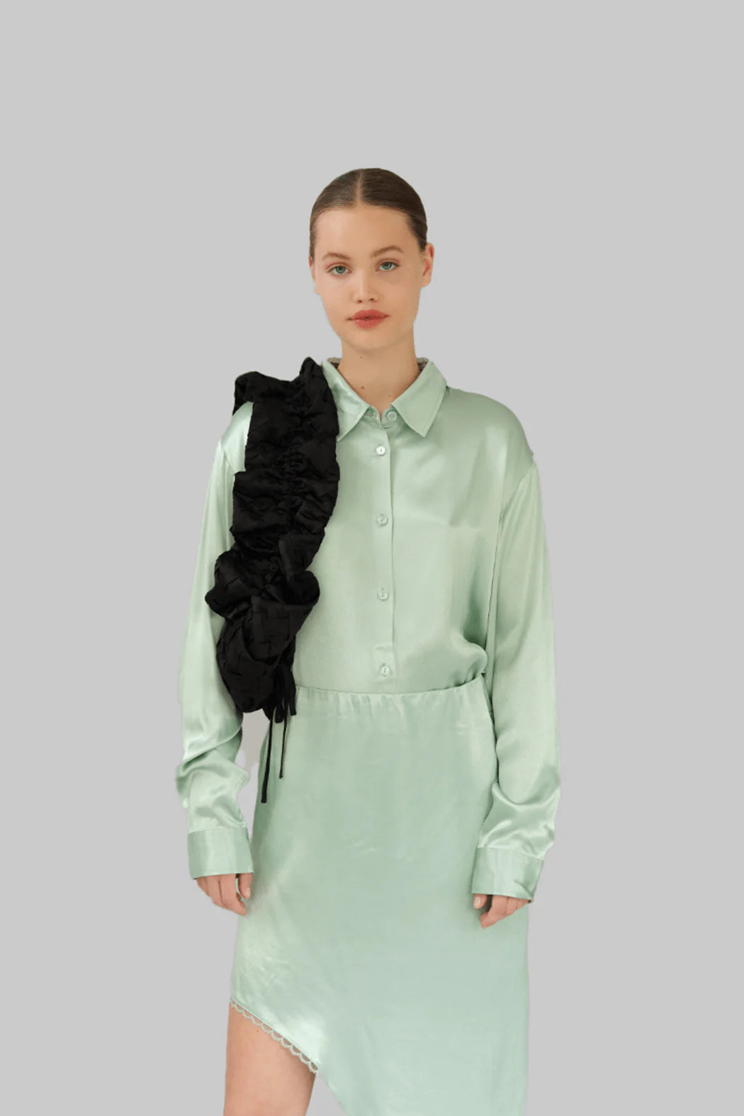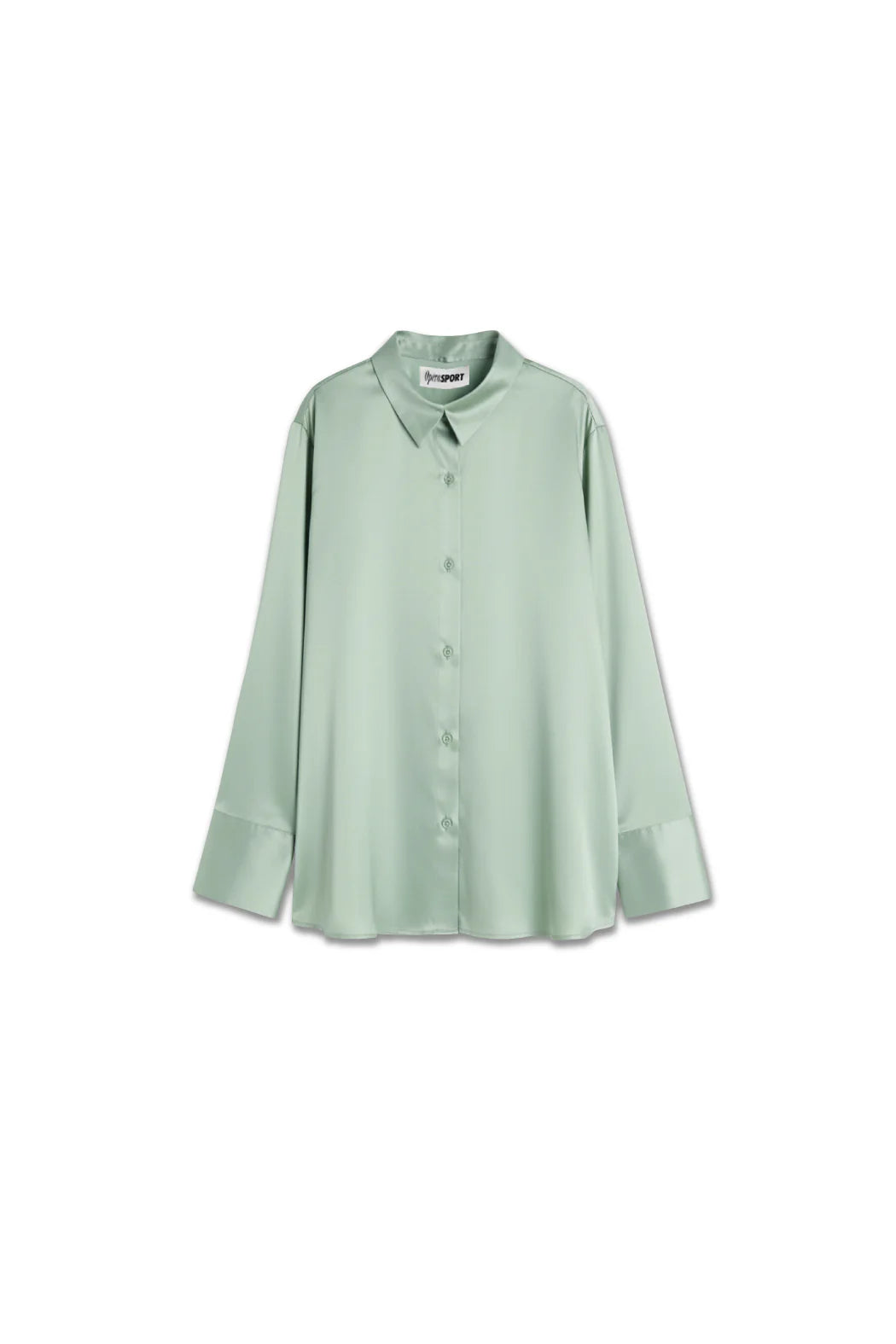 Shirt is crafted from 100% recycled polyester in a Mint Green shade. Designed with a relaxed fit, it features long sleeves, a classic collar, and buttons down the front. The satin-like finish adds an elegant touch, making it a versatile piece that can be styled casually or paired with the matching June Skirt for a coordinated look.