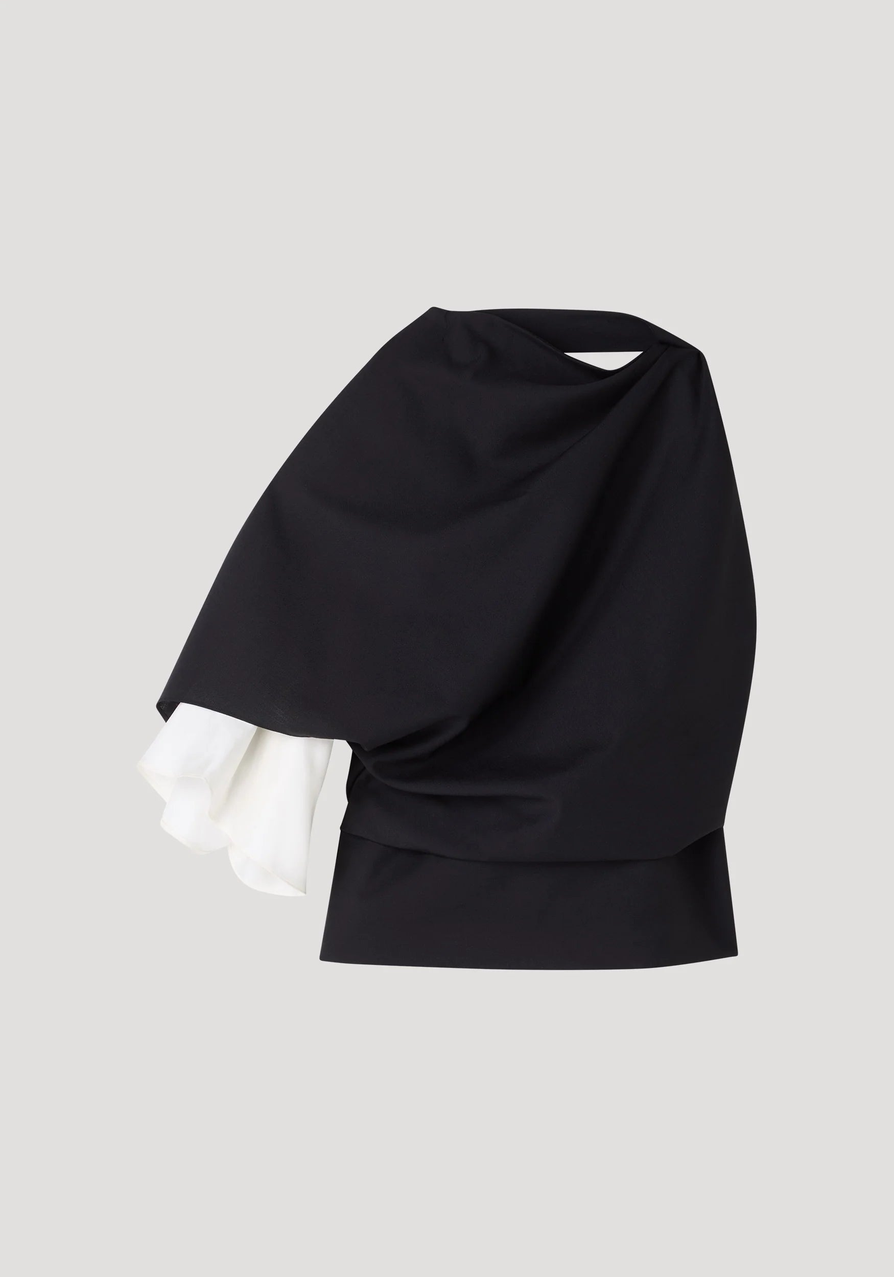 A draped silk top with a wrap construction that shapes the waist and reveals an open back. Finished with a single sleeve highlighted by a contrasting silk insert for a refined, asymmetric look.