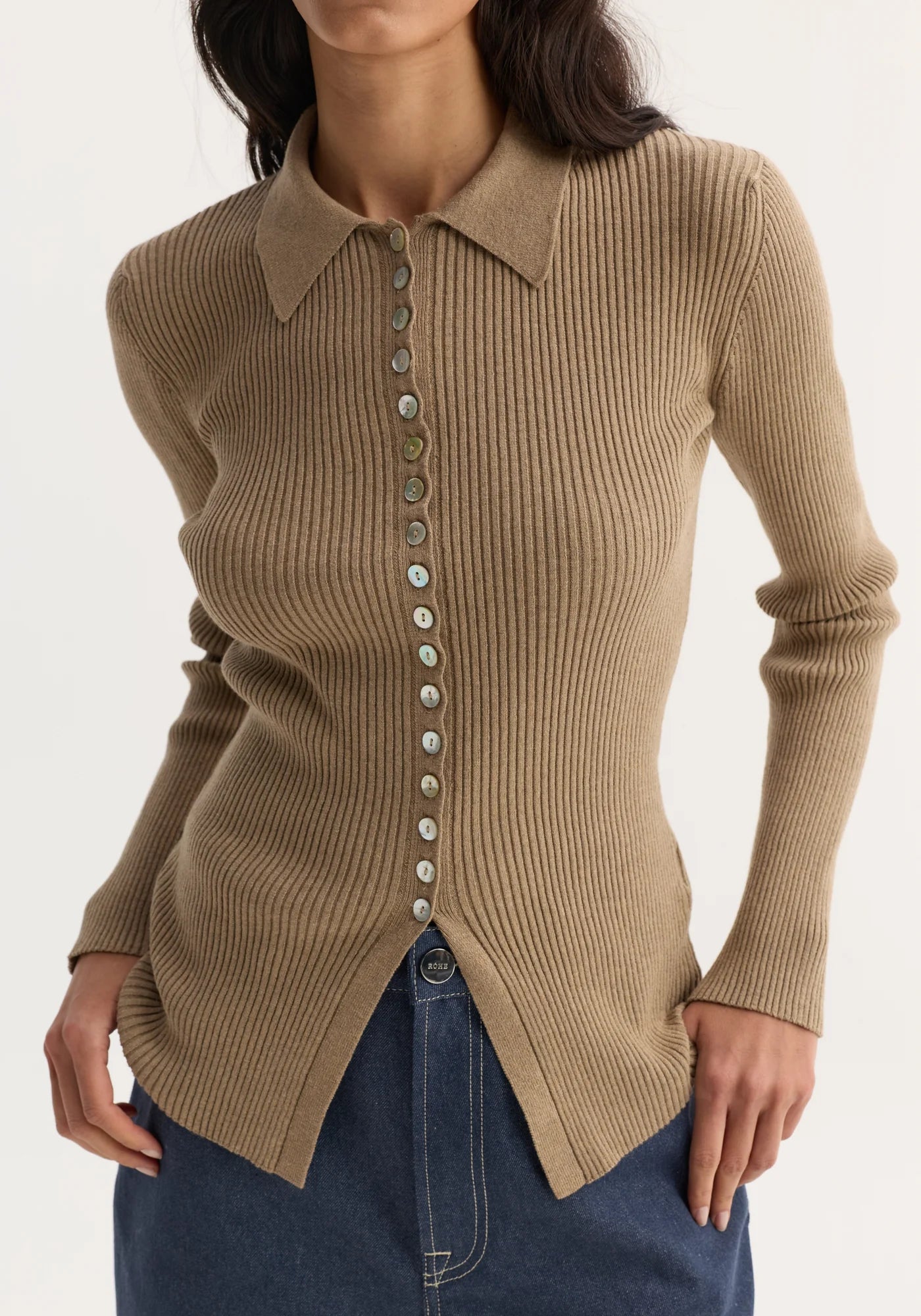 An elongated ribbed cardigan with a close-fitting silhouette, designed with a collar and front buttons that finish just below the waist to allow the hem to subtly flare.