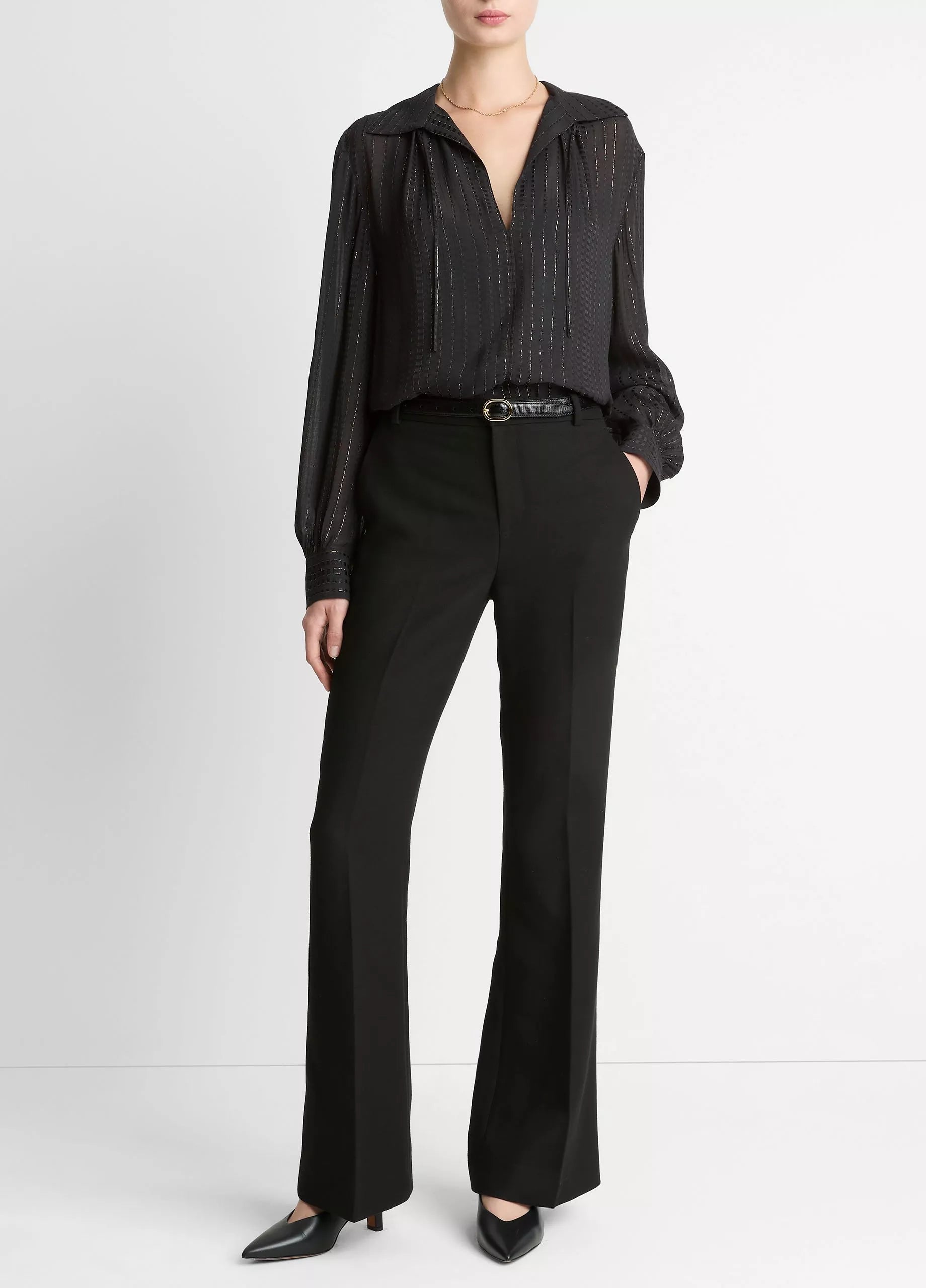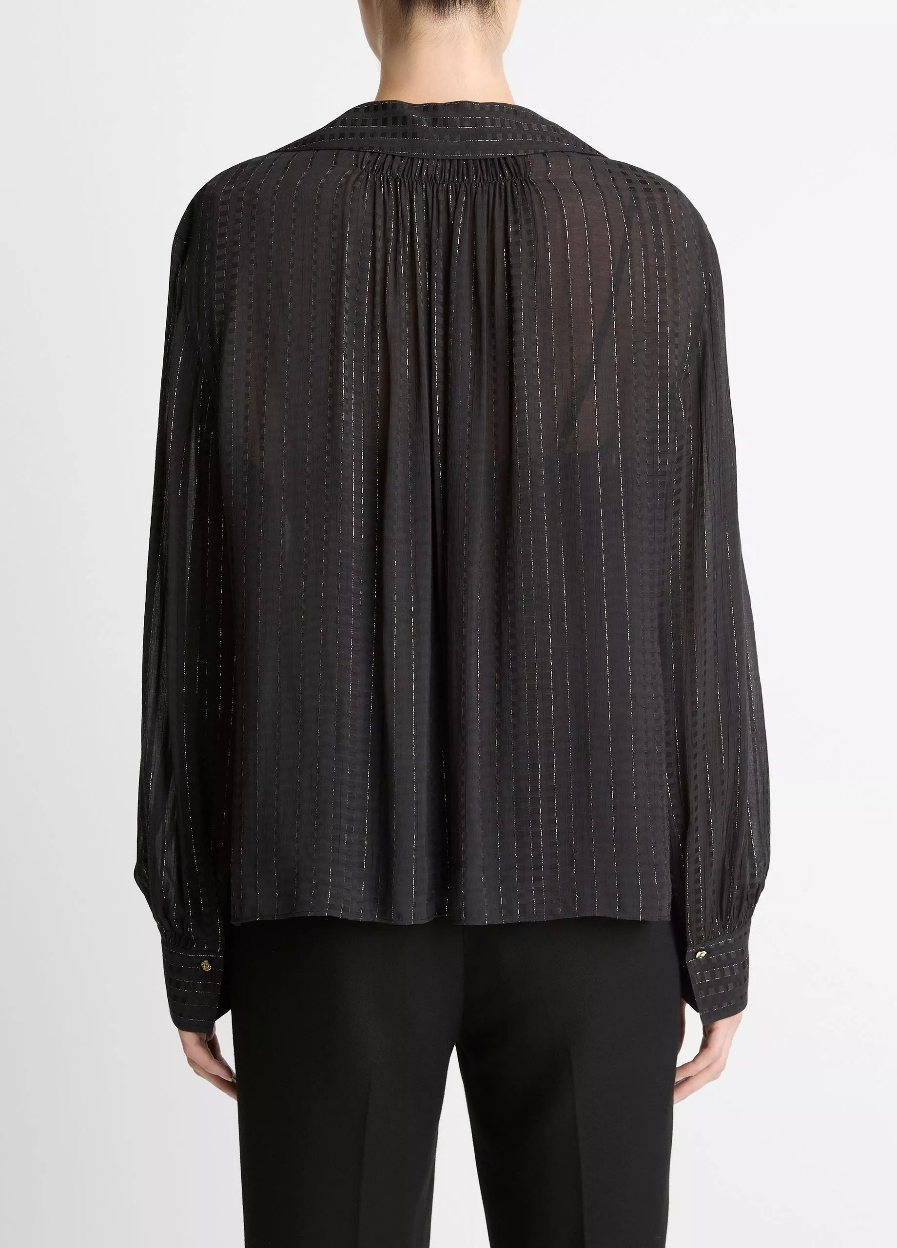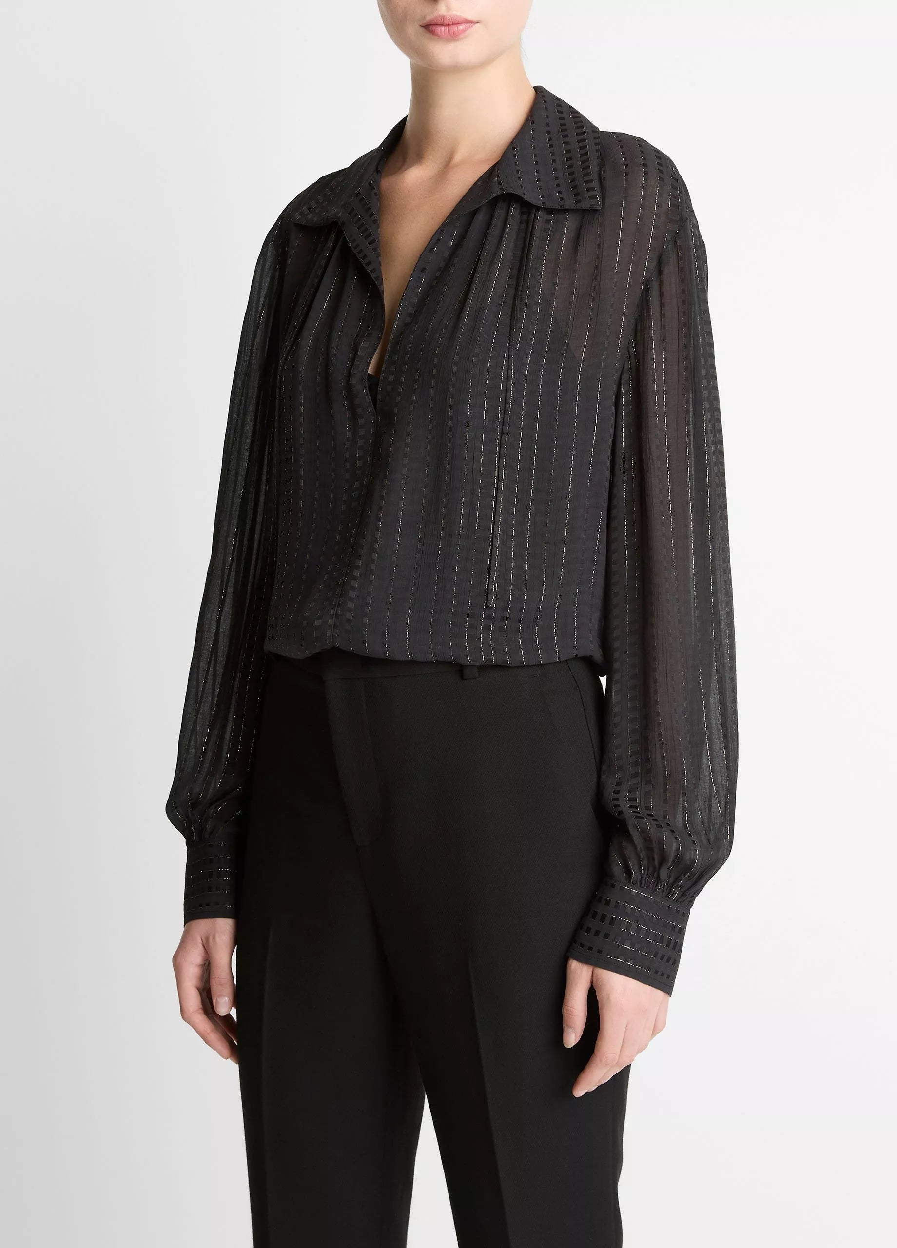 A dressy, after-dark staple, this collared blouse is crafted from semi-sheer striped jacquard fabric woven with metallic gold thread throughout that shimmers in the light. Pay close attention also to the cuffs, which we've finished with refined hammered metal buttons.